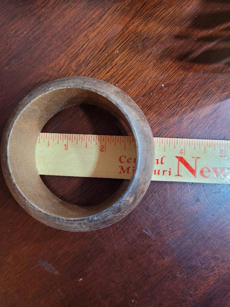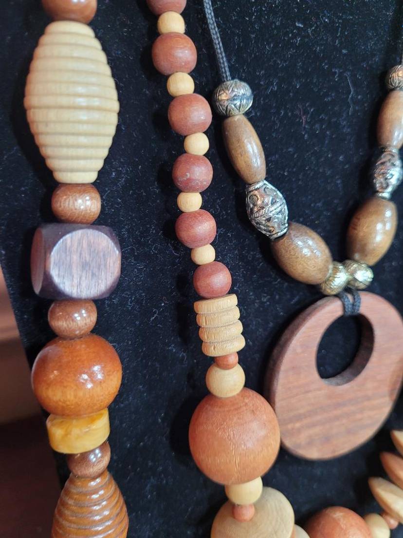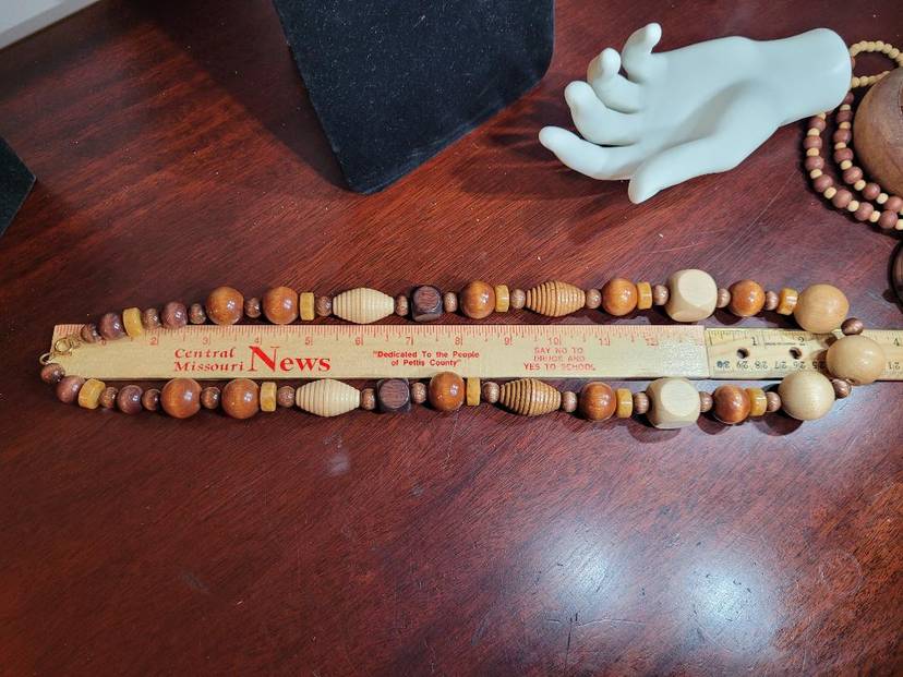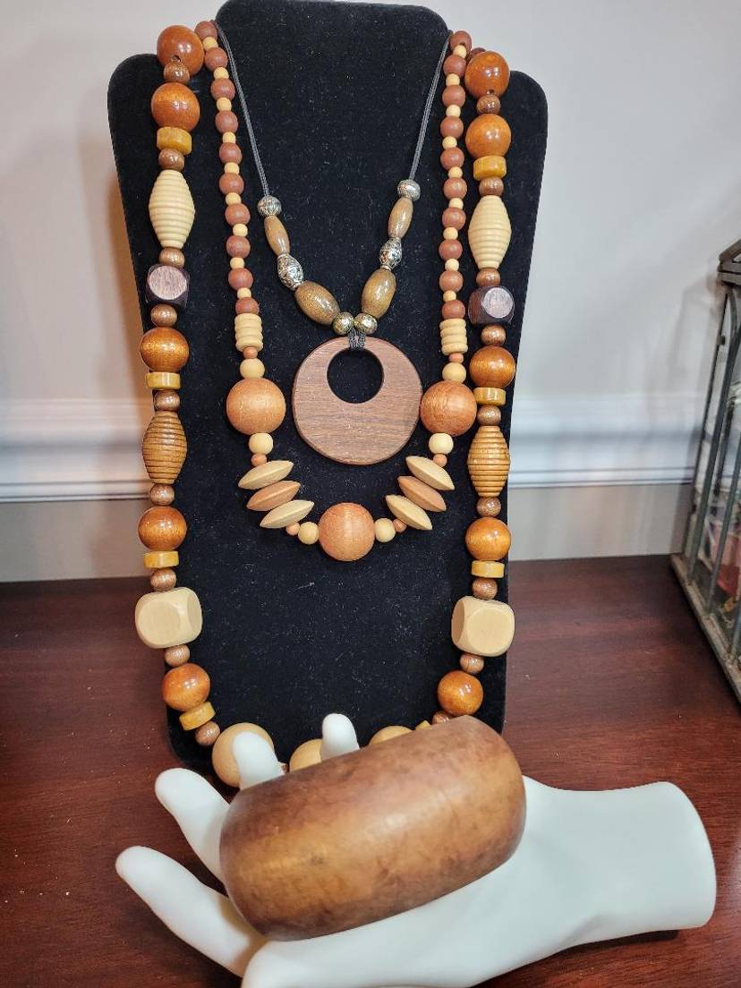 I have for sale a set of three wooden beaded necklaces and one wooden and gold accent bracelet. The bracelet is a solid 3 inch diameter and could use a good wood oil treatment. But it is solid. The first necklace is on a black cord with silver accent beads with dark wood beads leading to a dark wood pendant. It is 16 inches long and has a lobster claw clasp. The second necklace is a combination of light and dark wood beads and a variety of sizes. It is 22 inches long with a gold tone barrel clasp. The last necklace is a mix of light and dark and medium tone wooden beads that is 32 inches long with a gold tone spring load clasp. This one has a great SHINE to it. All these are in good condition. GREAT little collection.
