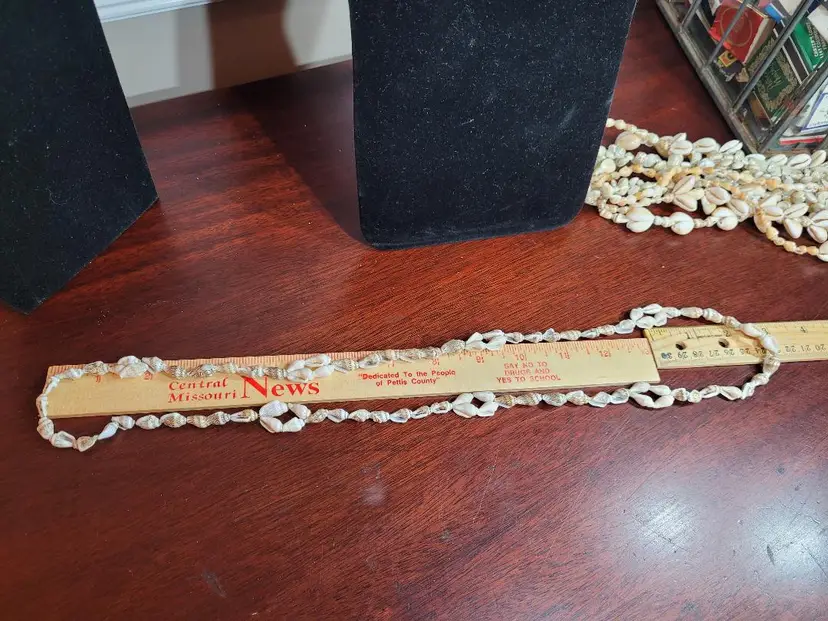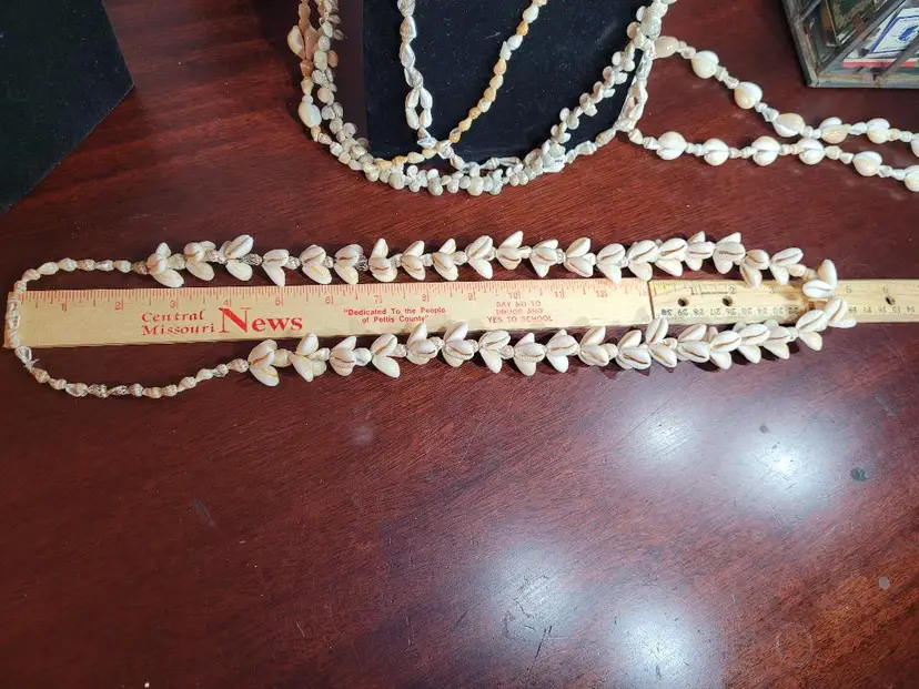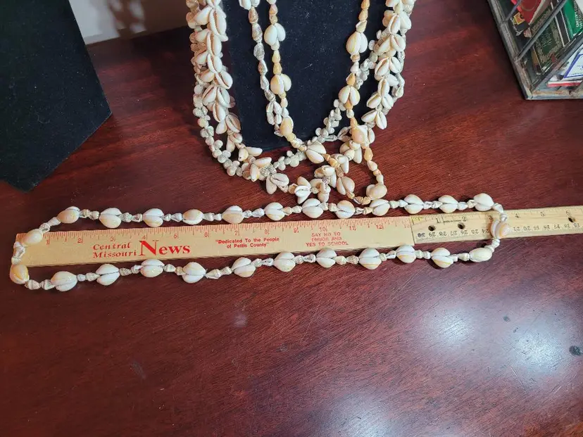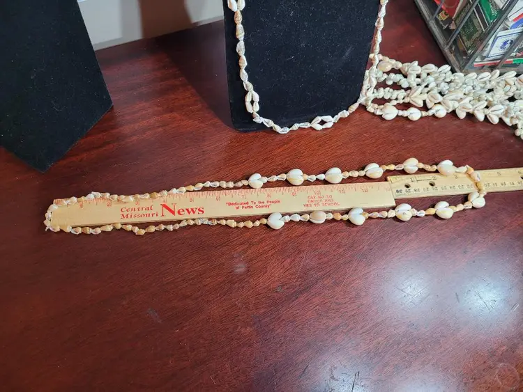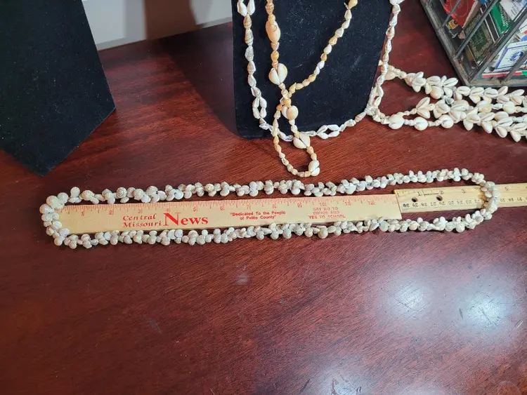 I have a LOT of 5 NATURAL SHELL Necklaces. ALL are about the same length at 32 inches long if open all the way. NONE have clasps. ALL are over the head style. Each one has different shells in various patterns. I do like that there are a couple with bigger shells on the bottom that have tiny shells around the neck, making them easier to wear. ALL for one money. I have several different sets of these, so check them out.