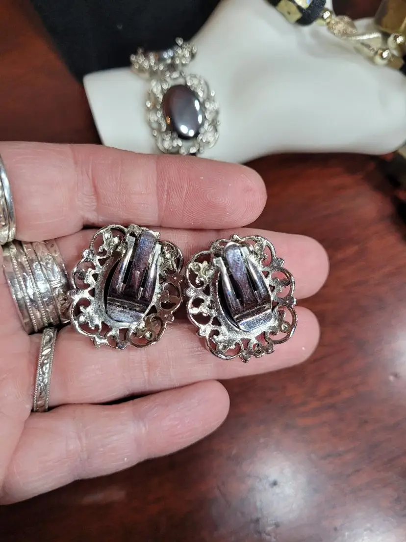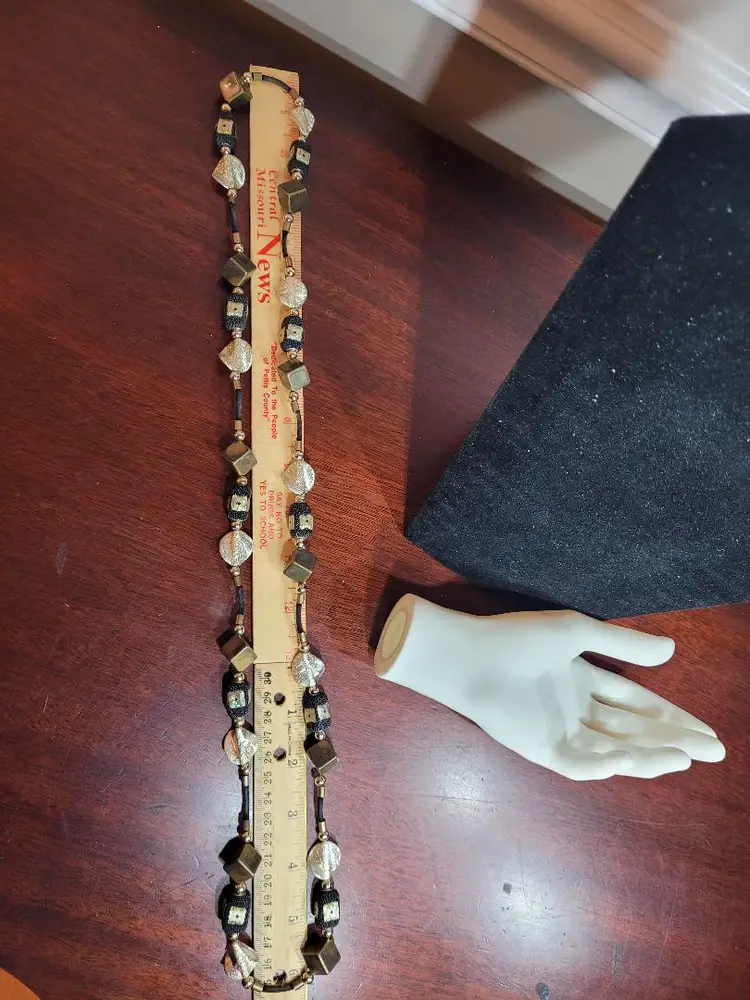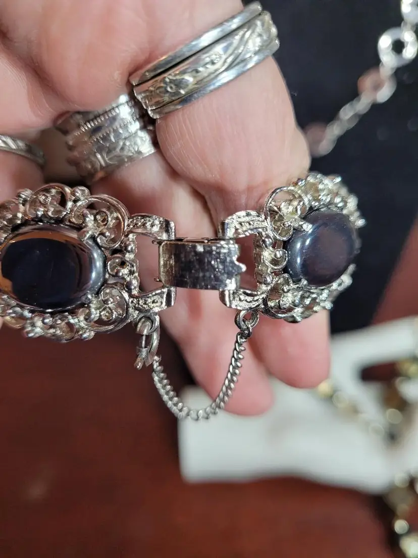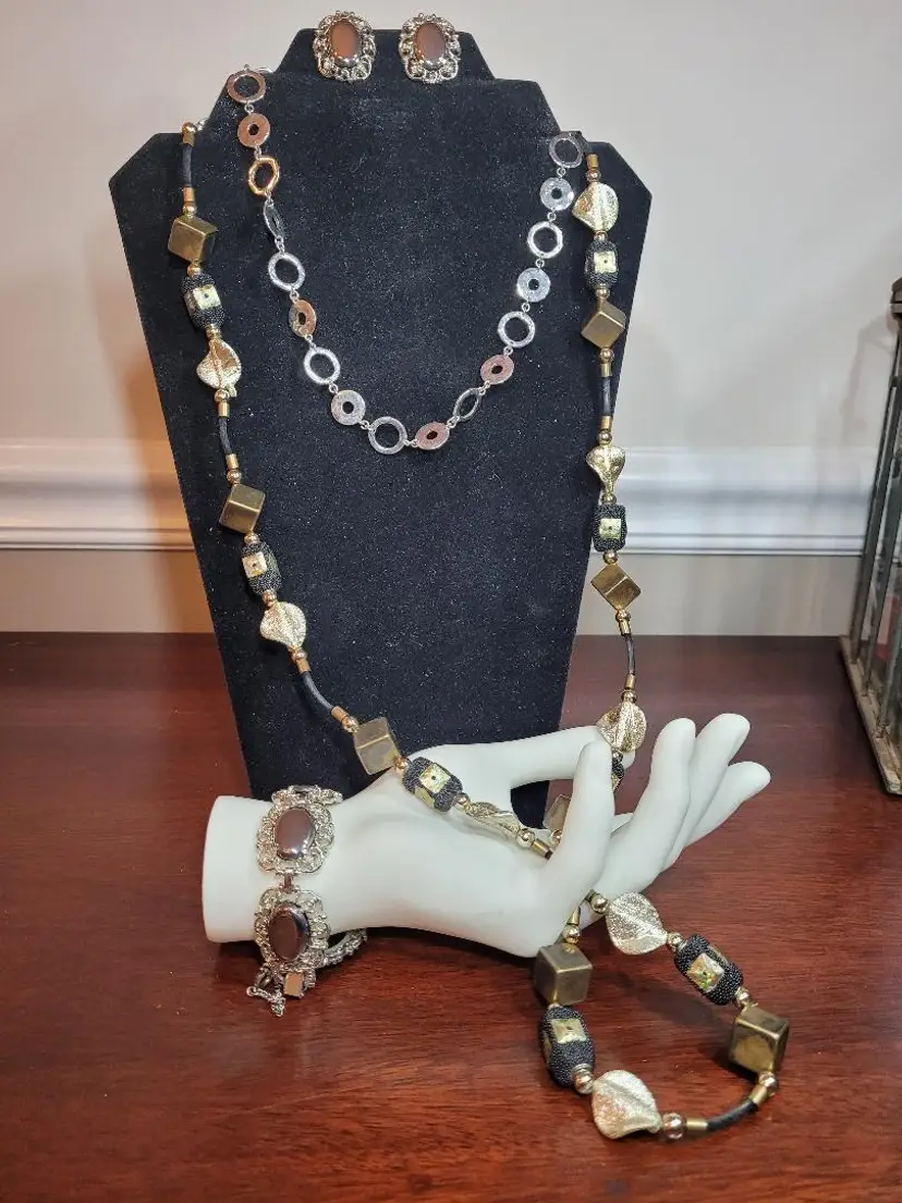 This lot includes two necklaces, and a bracelet with CLIP earring set. The Earrings and bracelet are silver tone with almost a mirrored, glass, or "hematite" color COLD pieces on them. VERY shiny and bright. Medium HEAVY. Earrings are clip and about and inch in length. The matching bracelet is also shiny, and 7 inches long with fold over clasp and safety chain. The shorter necklace is silver tone with TOGGLE claps and about 11 inches long. The longer necklace is a mix of resin beads, seed beads, shell beads, with black cording and both silver and gold tone elements worked in. VERY nice piece. It is 38 inches long. All pieces are in good used condition but tons of life left in them.