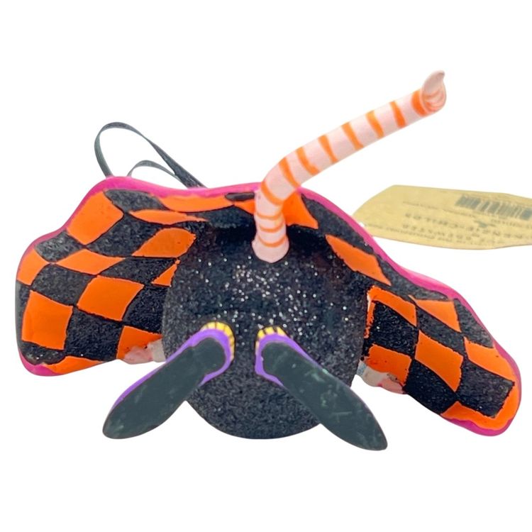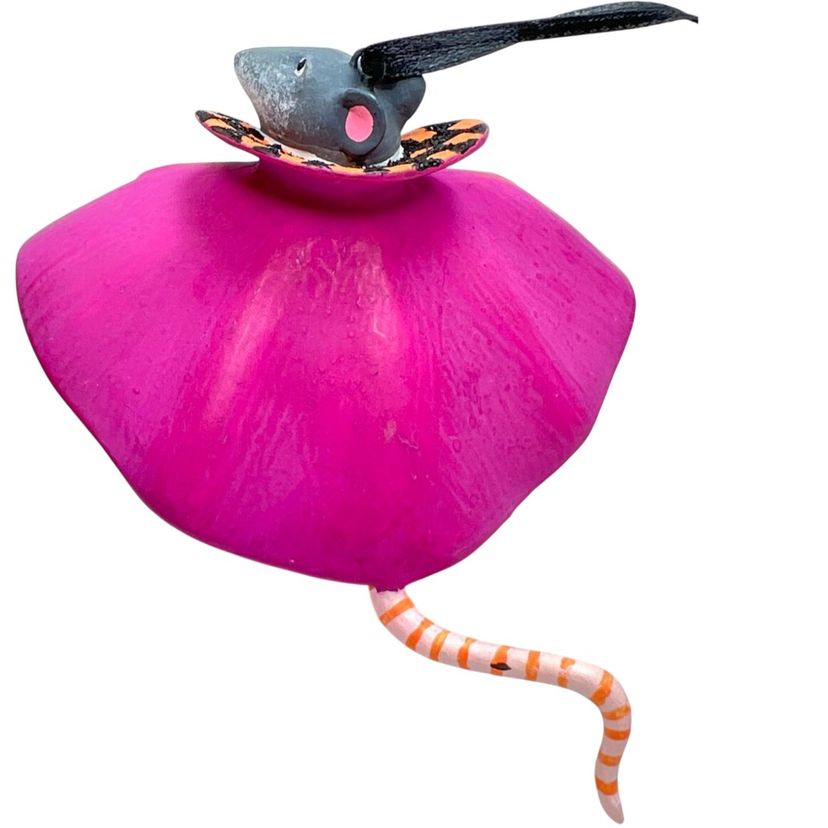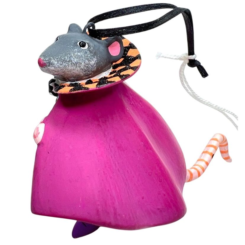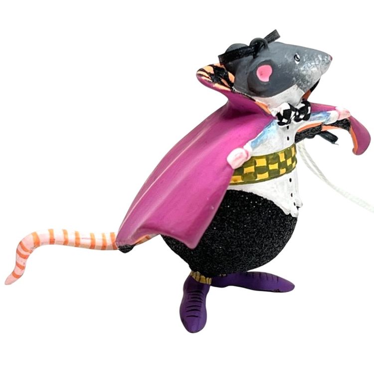 Handmade, Handpainted Fabulous magenta colored cloak with black & orange harlequin pattern interior. Mr. Ratula prefers to be addressed as “Count” as his family inherited the title as part of a countryside estate in Ratsylvania. The Count looks dapper in his polka dot bow tie, checked cummerbund, and purple shoes. Ready for an evening of dining on the local townsfolk. 🩸 His favorite meal is blood pudding, kidney pie, and ratatouille with a nice Chianti. Black string for hanging suspended like an ornament or bat 🦇 . Original tag. Made of some type of resin. Weighs 1.2 ounces. Height 2-1/4” Length 3” Width 1-1/2” Condition: New with tag. His tail has 1 spot with black paint dab- see last photo.