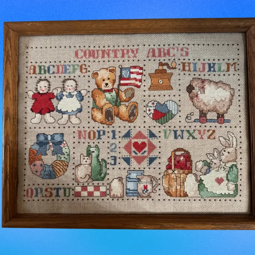 This is a framed cross-stitch sampler titled "Country ABC's" by Dimensions, designed by Barbara Mock. The design features a country-themed alphabet with various folk art images. The images include a teddy bear holding an American flag, two dolls, a lamb on wheels, a coffee grinder, a wreath, a cat, a bunny, a basket, and a heart. The pattern is a vintage item from 1989 Great vintage condition