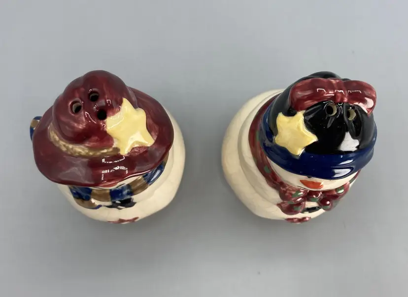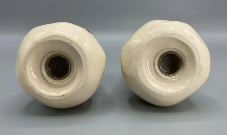 This salt and pepper shaker set is in good condition. Both shakers have crazing throughout due to age. Please see pictures for specific details. They both have their original stopper. Each shaker measures approximately 4 1/2" tall and 2 1/2" wide.