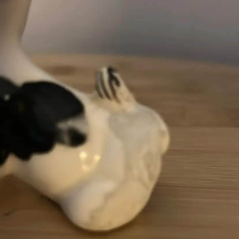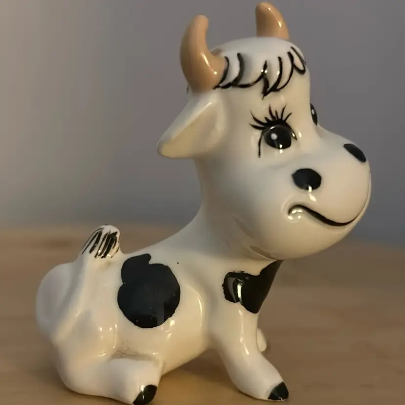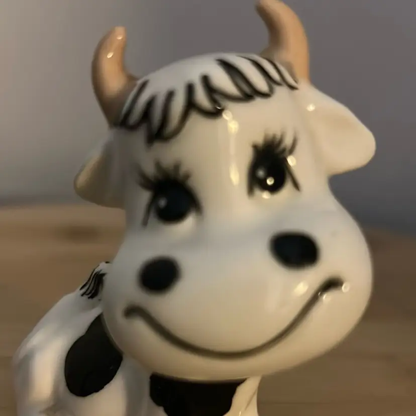 Adorable Cow figurine. Does have a little paint loss on one side & on that same side is a smooth patch by his leg. It looks like a manufactor defect that they forgot to put gloss on that part of the leg. Otherwise , he is in great shape.