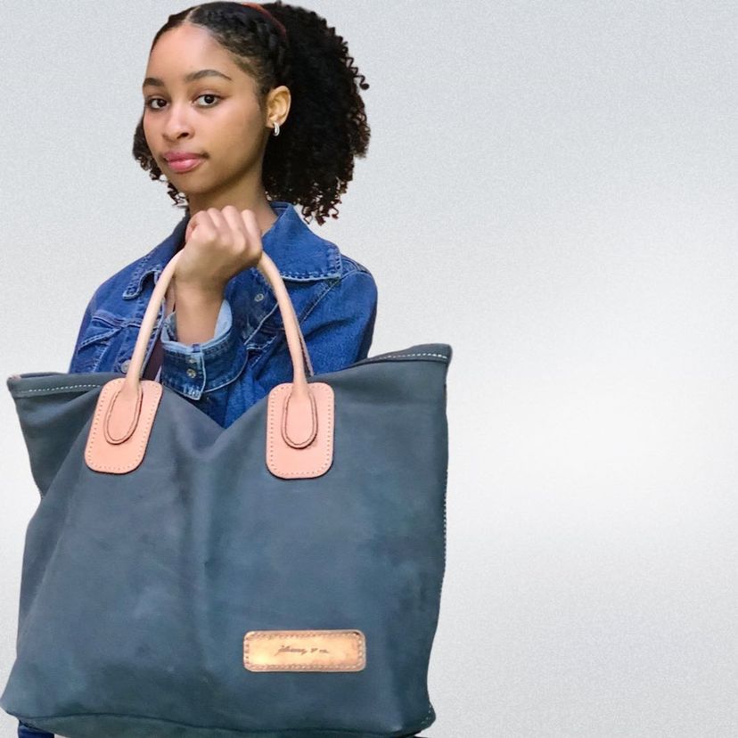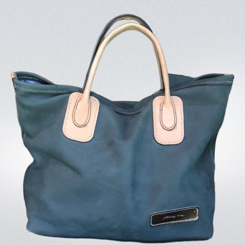 Exquisite craftsmanship in bold suede. Only 40 limited edition available. The Cradle Tote a simple everyday tote, featured in gray suede with pocket in sky blue rayon. Makes a perfect accent to any summer or vacation wardrobe.