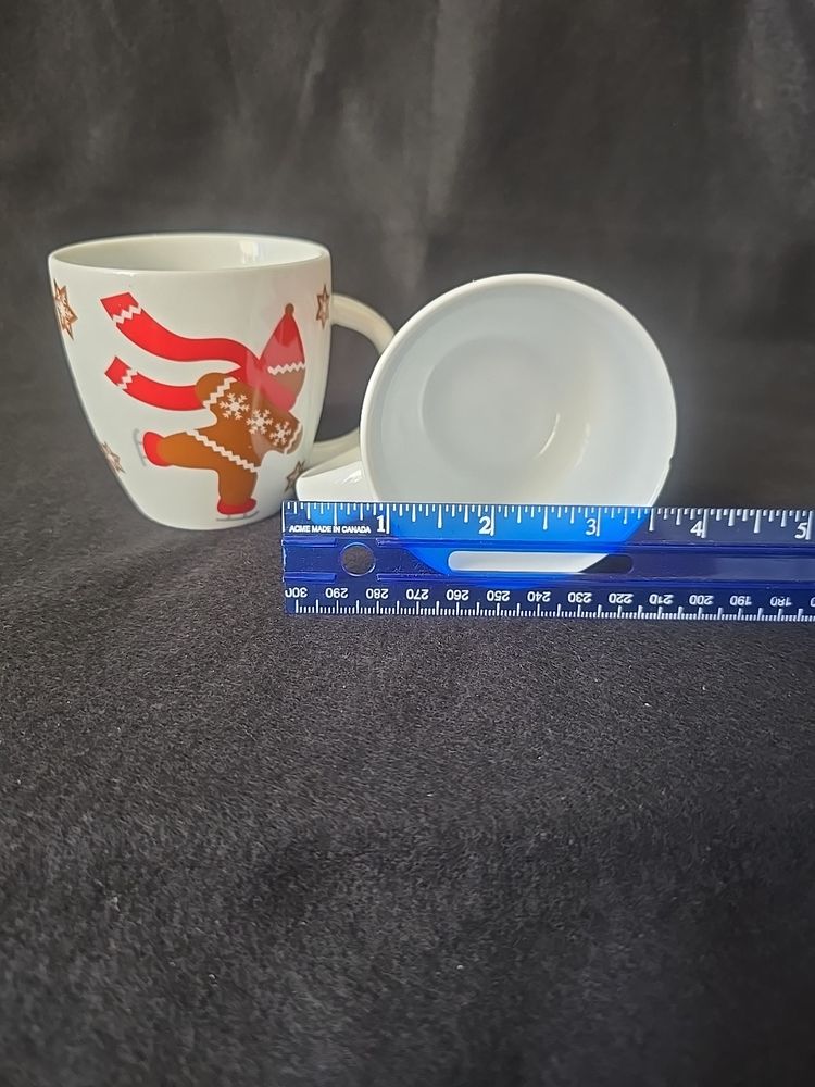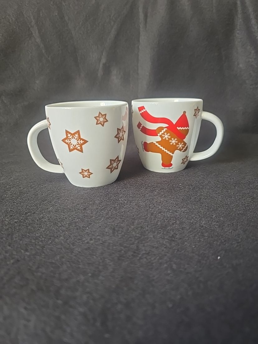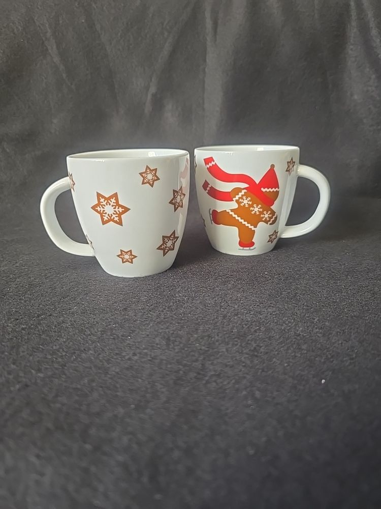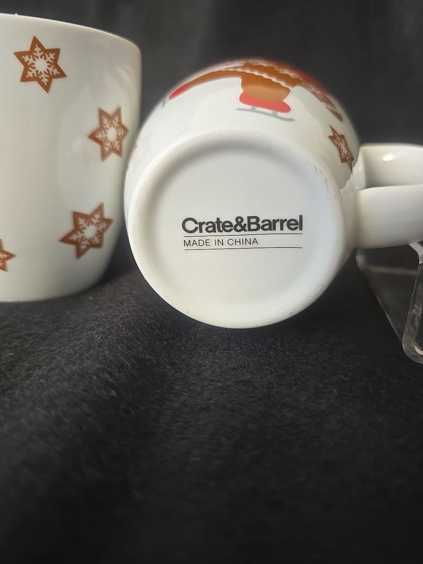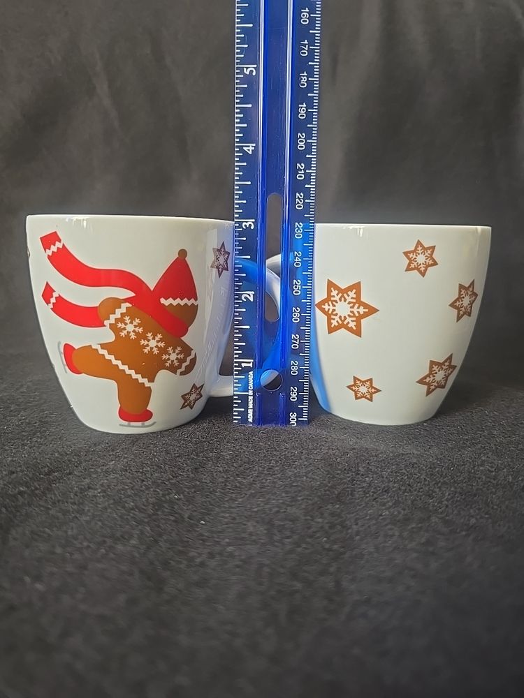 Festive set of 2 espresso / mini cocoa mugs from Crate & Barrel, perfect for the holidays. Each cup shows a skating gingerbread man with red scarf and hat on one side and brown snowflake stars on the other.