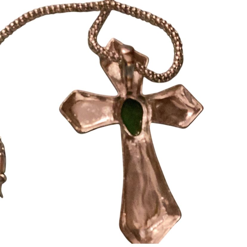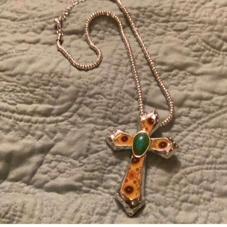 Here you have a beautiful silver toed cross pendant with a green stone of some sort in the middle and yellow flowers and laid on the edges, silver toned chain with a lobster claw class has an extension very pretty