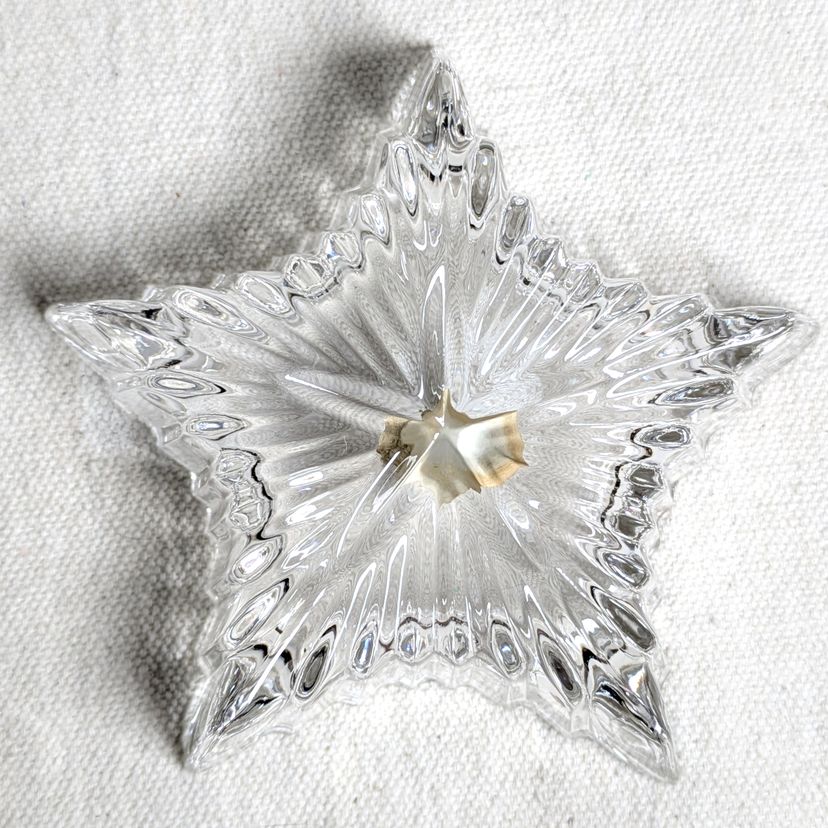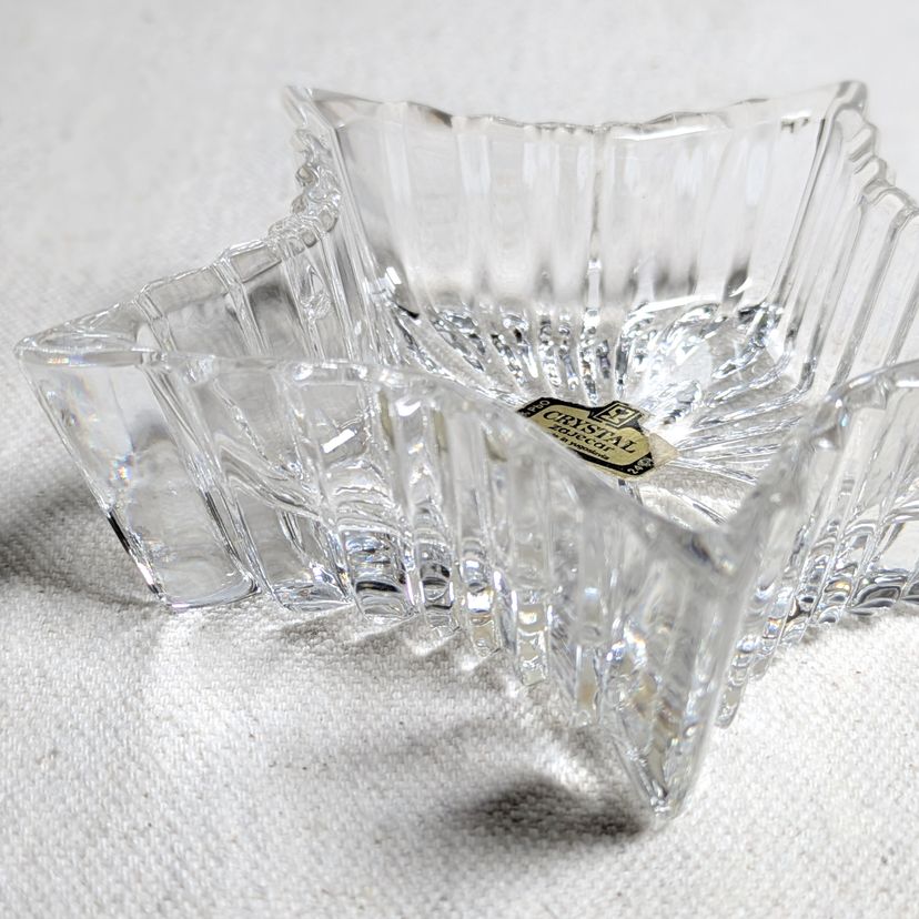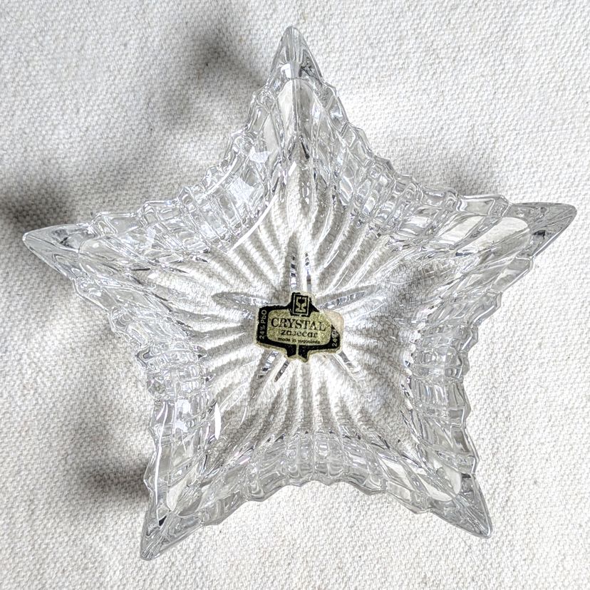 Beautiful star-shaped trinket dish made out of crystal. The beautiful facets to catch the light. Has a Made in Yugoslavia sticker with company name, on the inside of the dish. Yugoslavia is a country that no longer exists, it was made up of multiple republics, including Serbia, Croatia, Bosnia and Herzegovina, and Slovenia from the years 1918-1992. This dish is in good vintage condition, there is one point that has a fleabite chip that isnt very visible to the naked eye but can be felt.