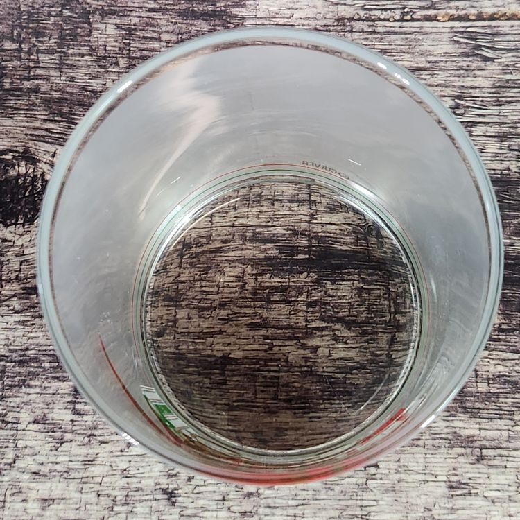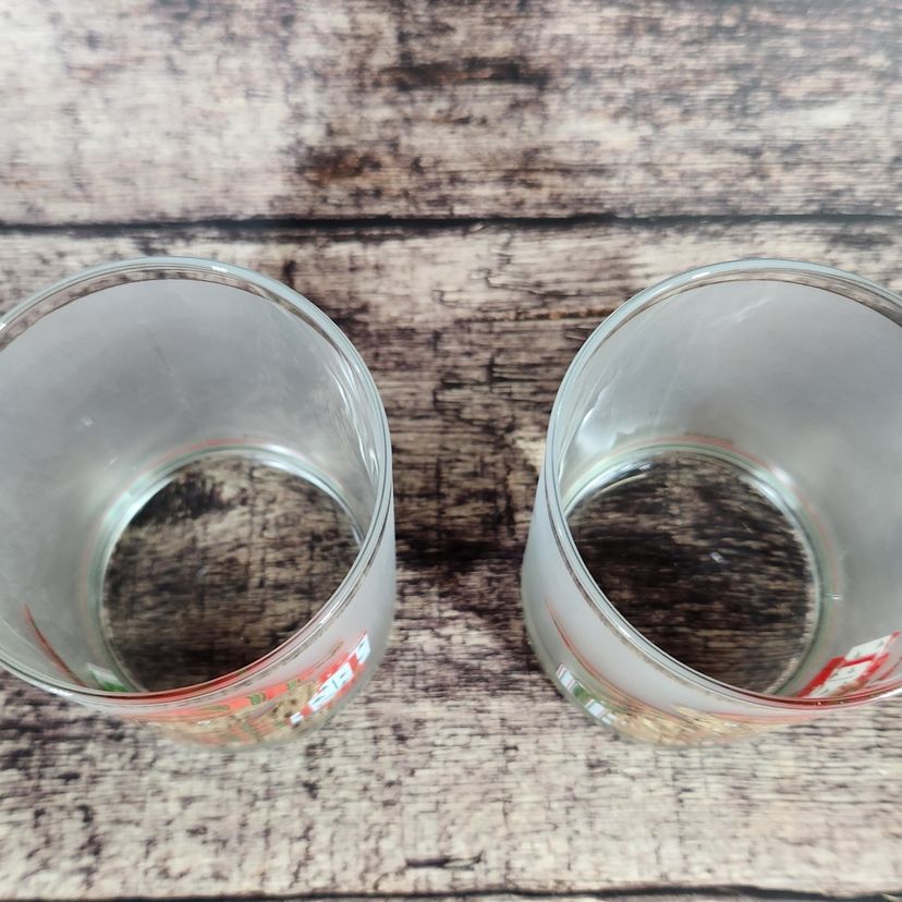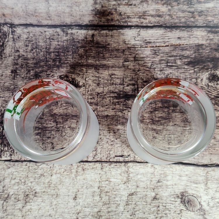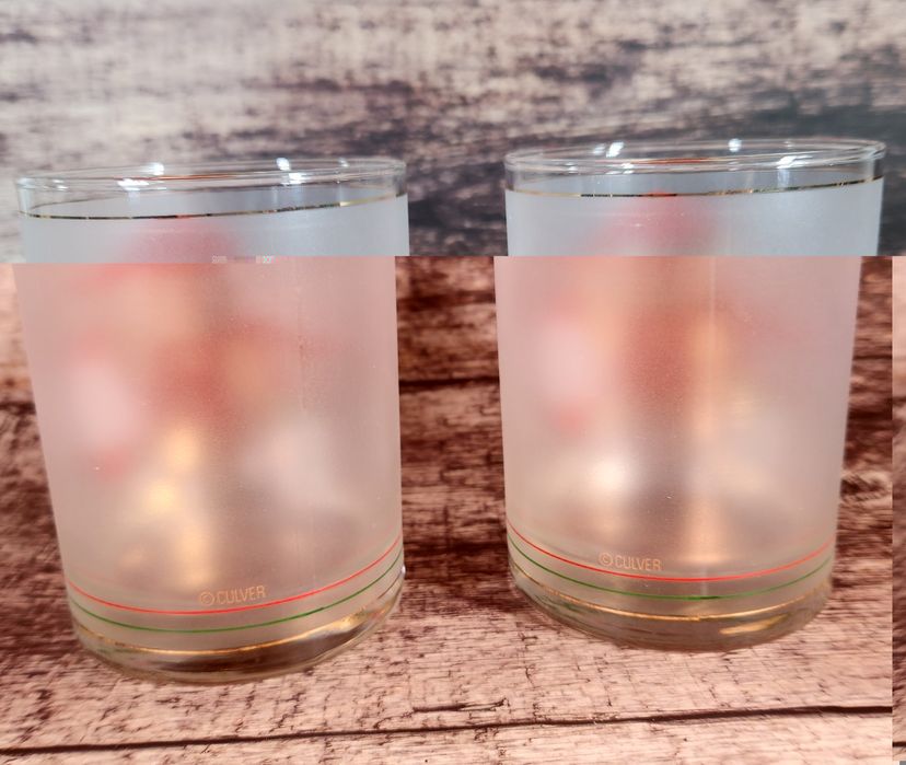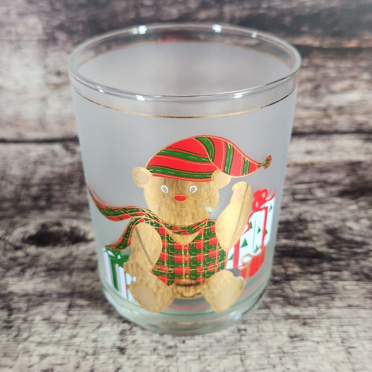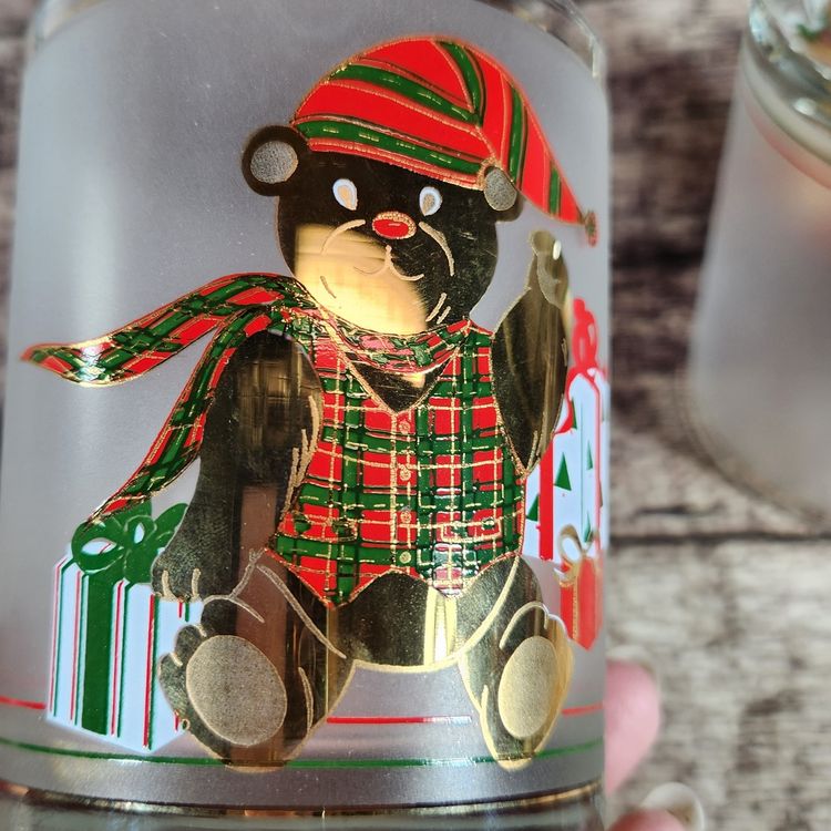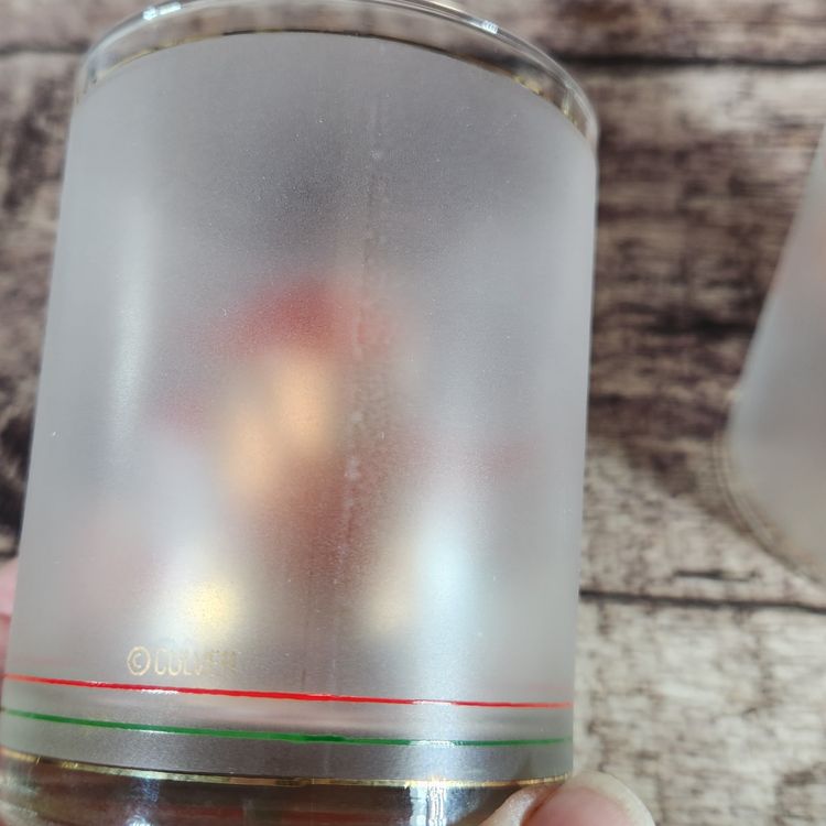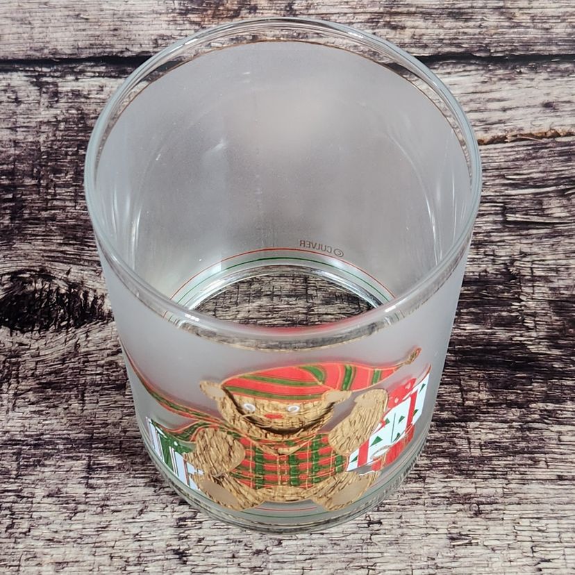 Single Culver oversized rocks glasses in their “Christmas Bear” pattern, sometimes also known as Yule Bear. These are lowball rocks whisky glasses, great for your favorite beverages at the holidays or anytime. Would be so cute with milk when you leave Santa his cookies! These feature a teddy bear & gifts in gold, red, green & white with gold, red & green stripes around the glass top & bottom border. The design is done in 22K gold which is very reflective and difficult to photograph. The signature font on these glasses means they are from the late 70s/early 1980s.