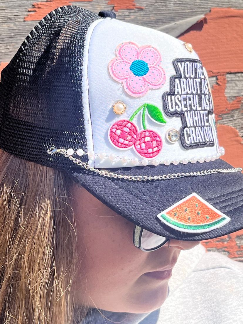 “YOU’RE ABOUT AS USEFUL AS A WHITE CRAYON” main patch with additional patches surrounding. Has bling pins and a stylish pearl & chain for the brim.