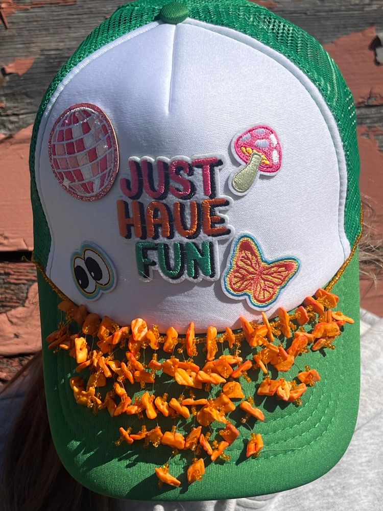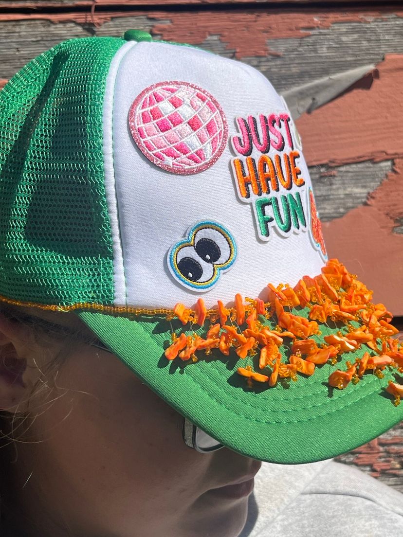 Standard SnapBack green and white trucker hat. Custom made with center patch JUST HAVE FUN and smaller patches to add more pop! Bill has orange shell band hand sewn to hat.