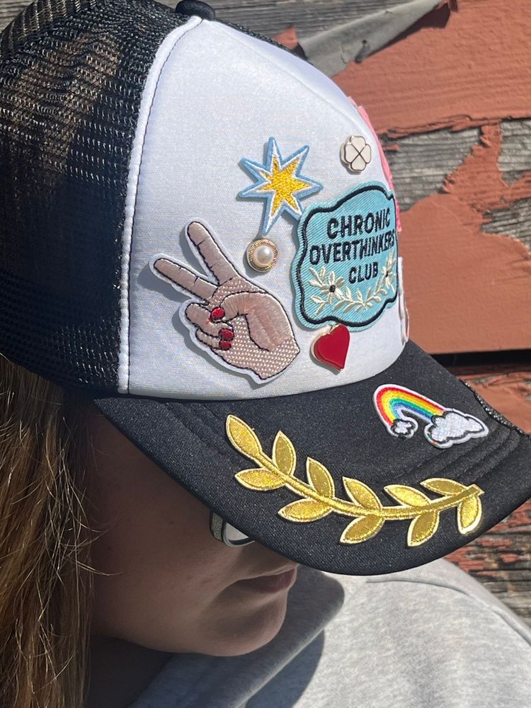 “Overthinker” patch with additional patches to make this hat standout with a unique flare.
