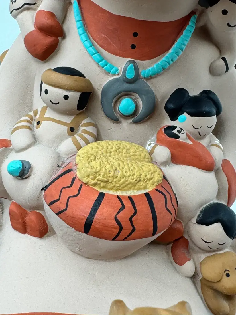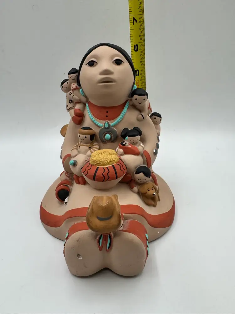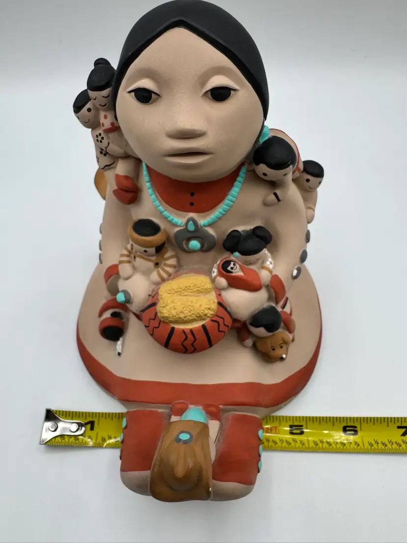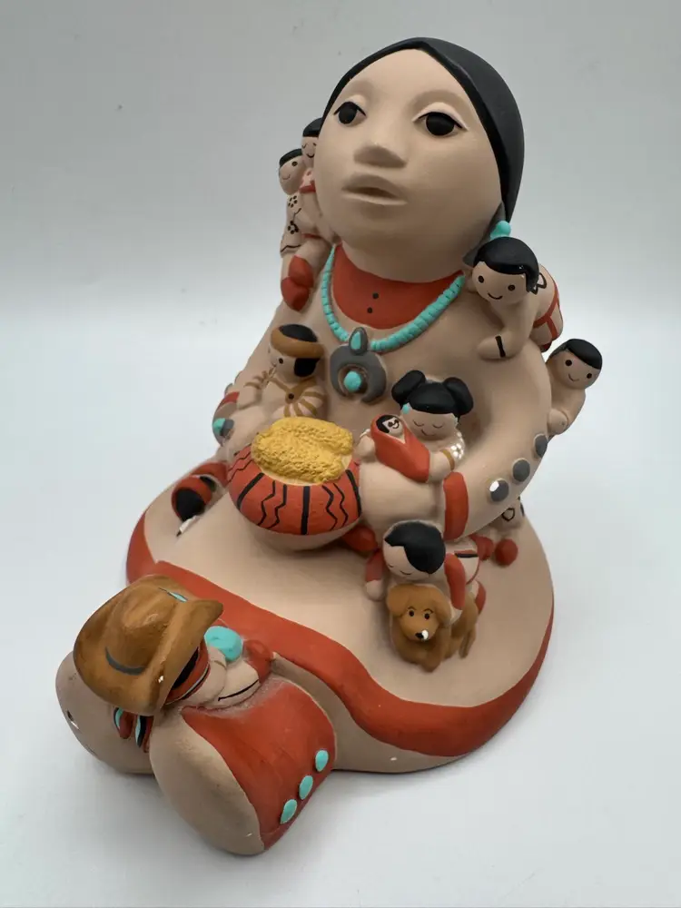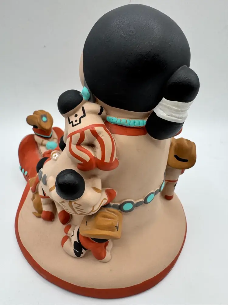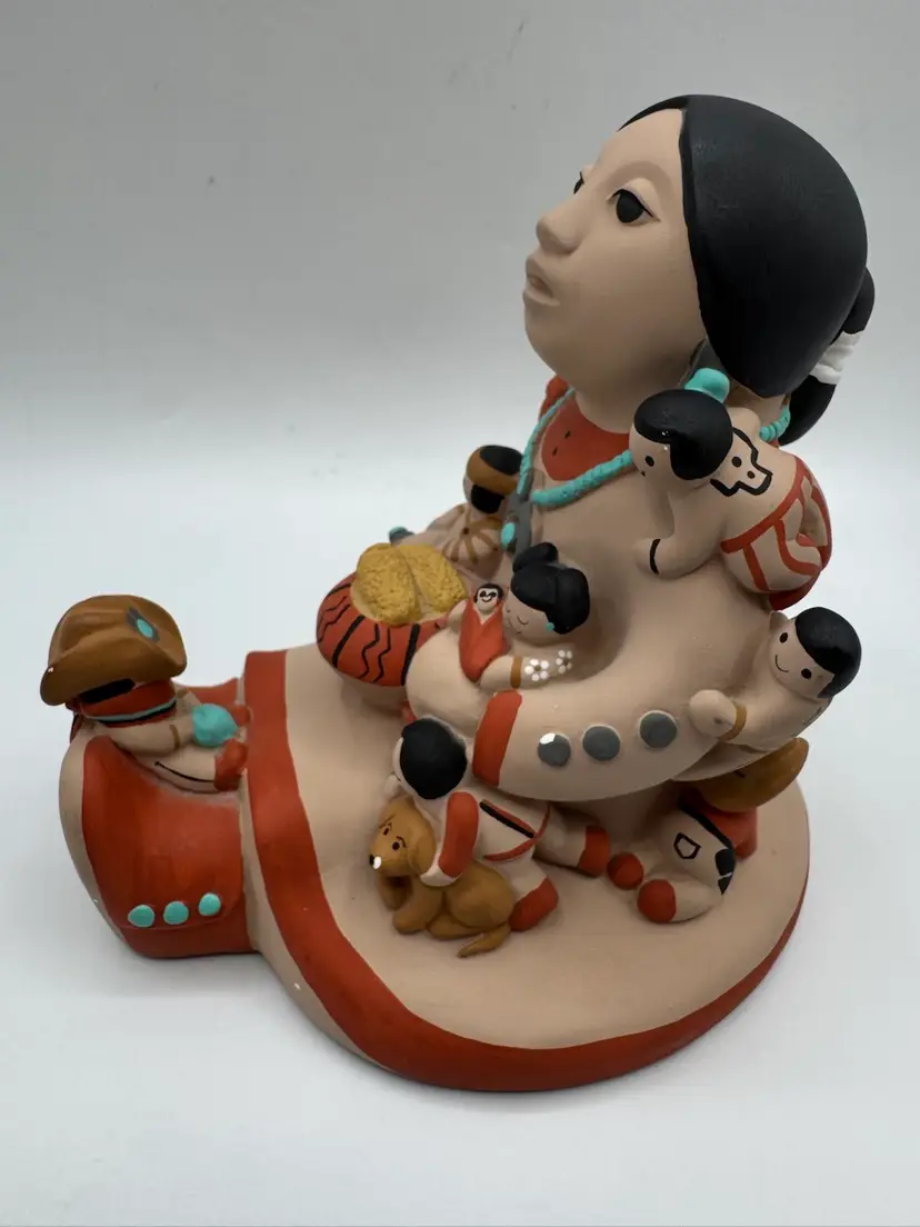 Type: Pueblo-style storyteller pottery figurine featuring a seated woman with 11 children and a dog.
