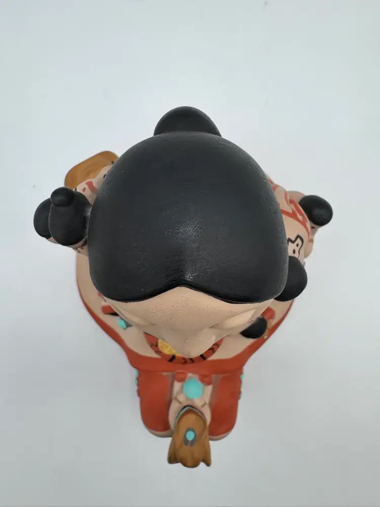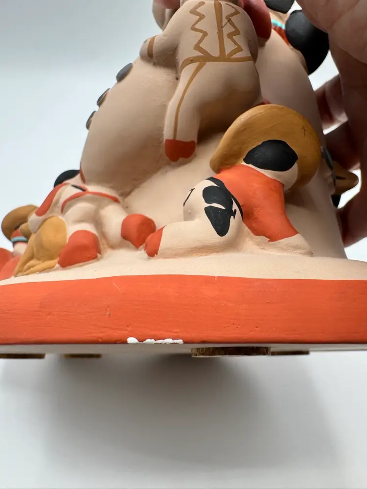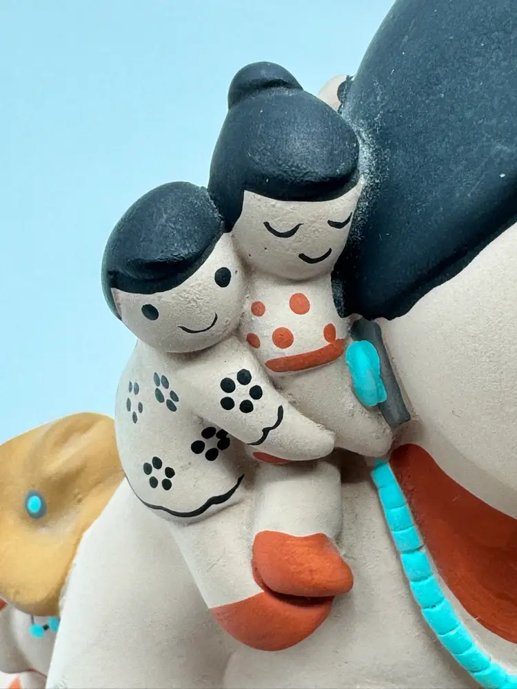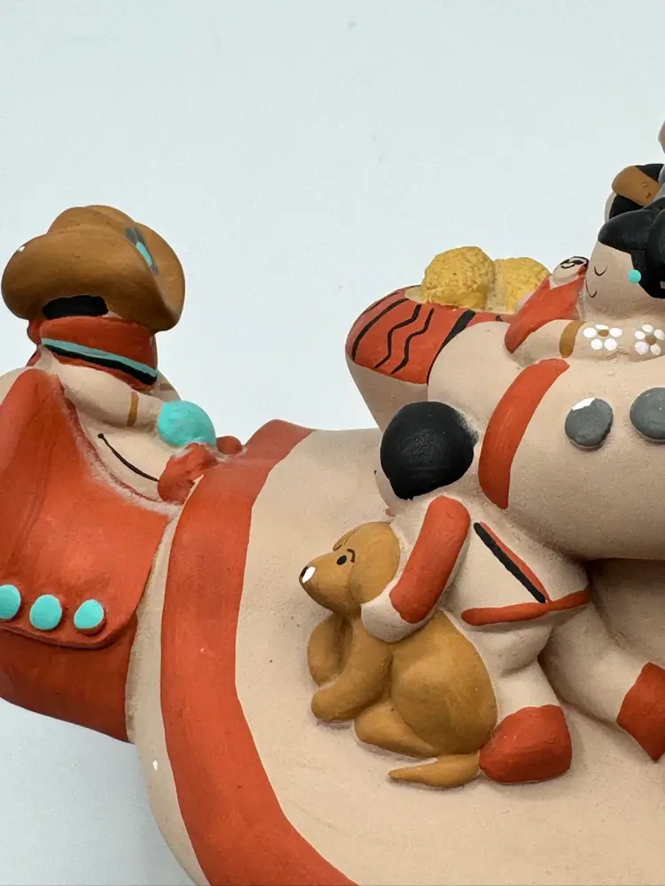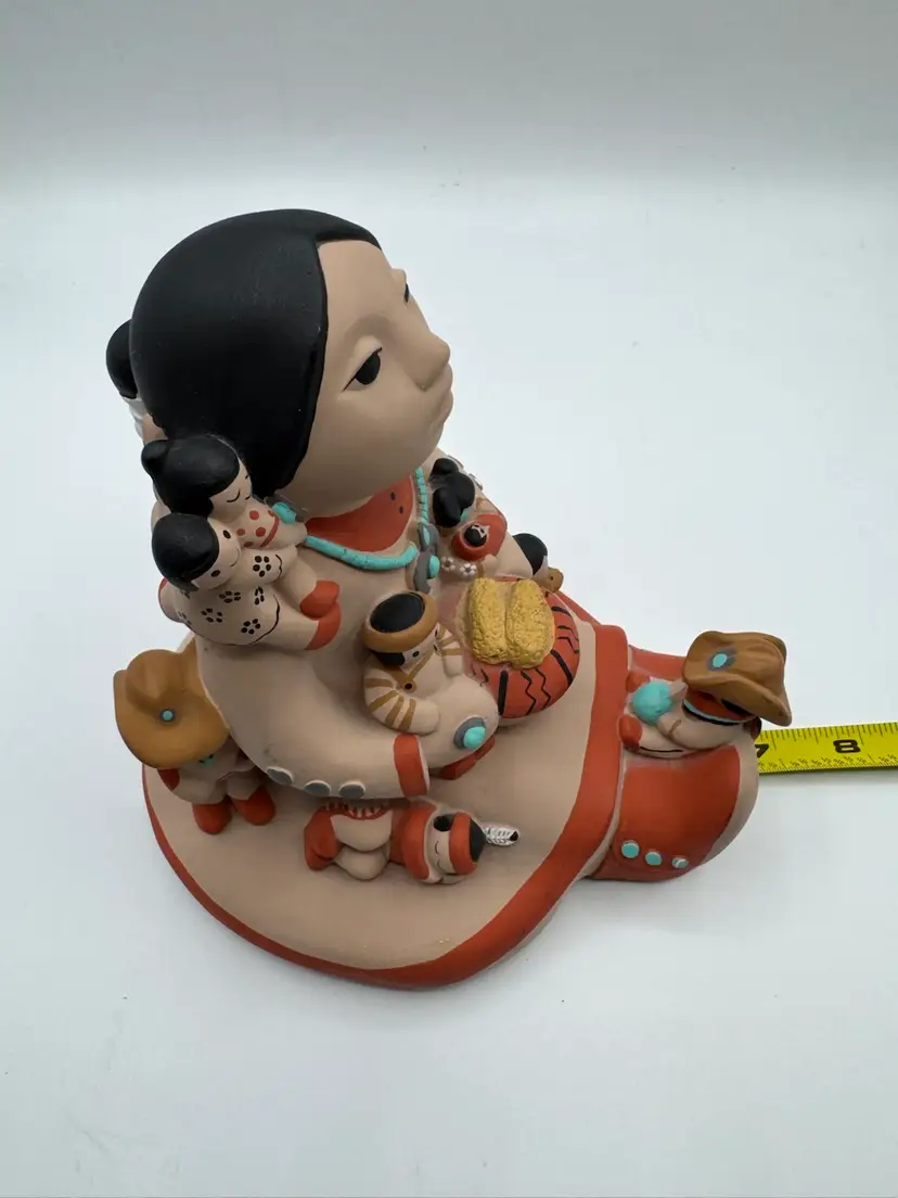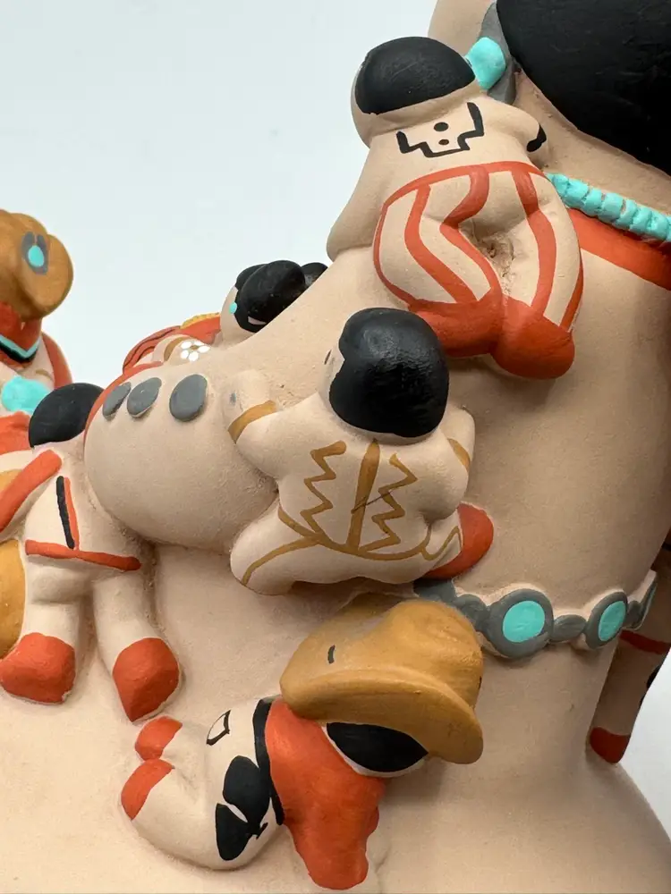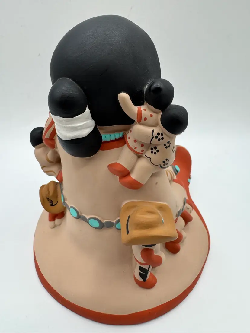Type: Pueblo-style storyteller pottery figurine featuring a seated woman with 11 children and a dog.