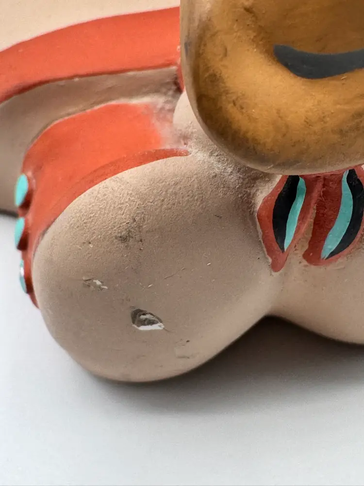 Material: Hand-painted clay/ceramic in natural sand and terra-cotta tones with black and turquoise accents.