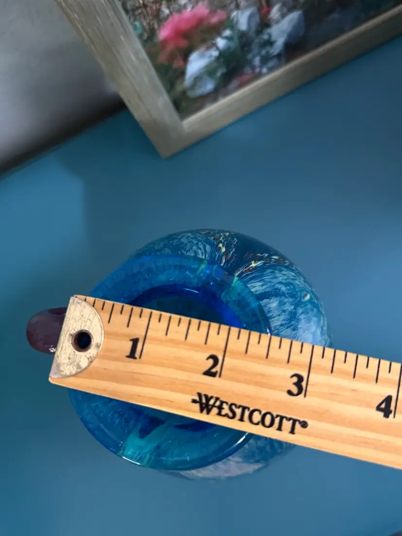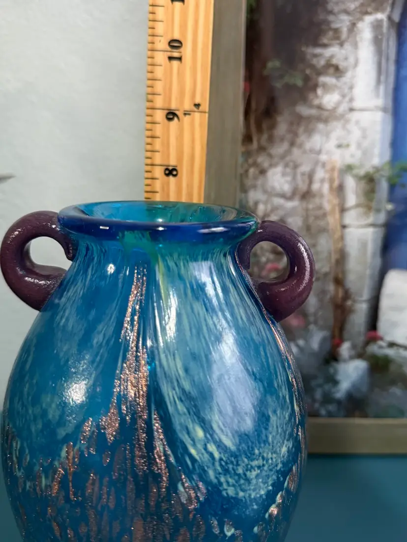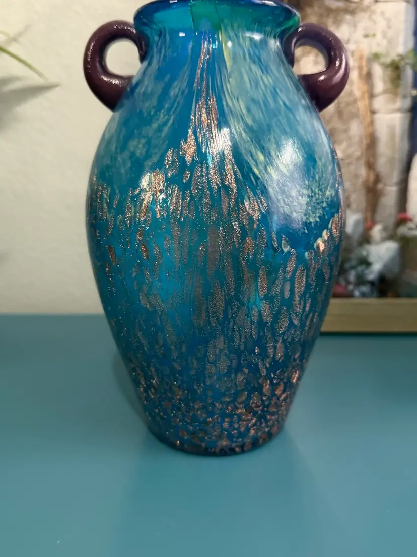 The style is part of the Milano Favrile Hand-blown art glass, with color ingrained in the glass itself using a variety of metals. Amphora shape with two applied handles and copper glitter speckles. Mottled aqua blue body, gold/cream accents, copper flecks, and purple handles.