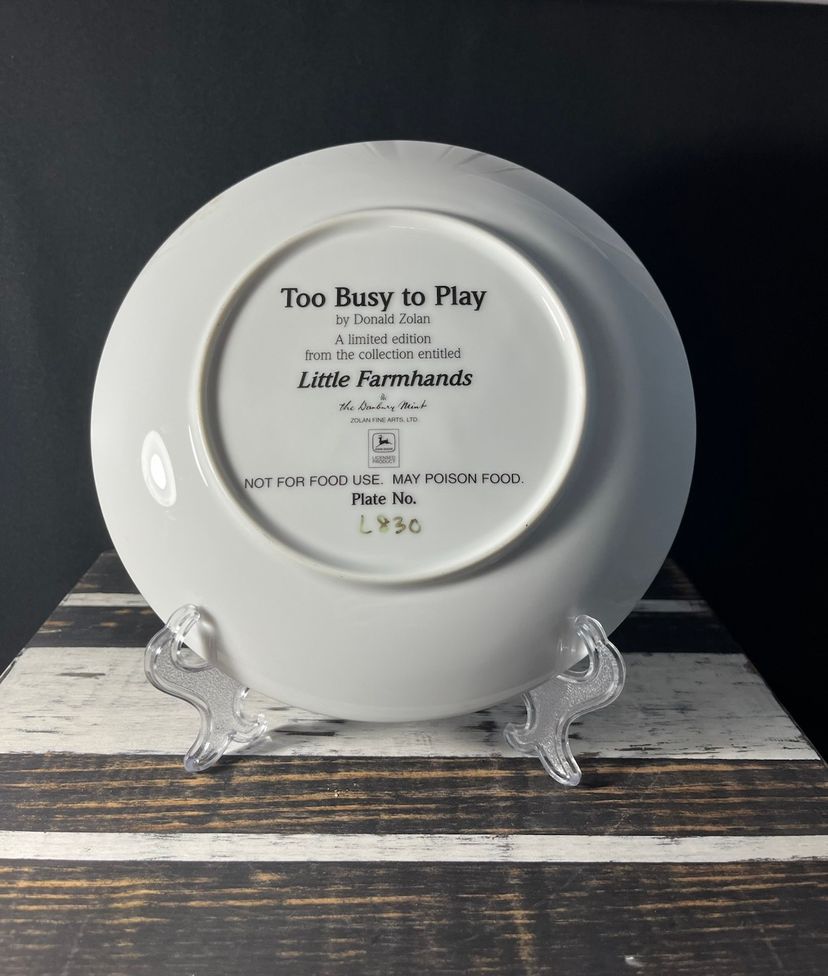 #1544. Adorable Danbury Mint 8” Little Farmhands Collector Plate- “Too Busy To Play”signed by Donald Zolan and numbered L830. I HAVE 4 DIFFERENT PLATES LISTED, IF INTERESTED IN ALL, MESSAGE ME!