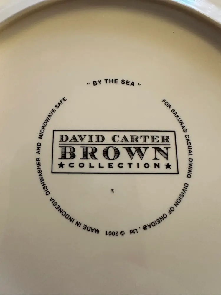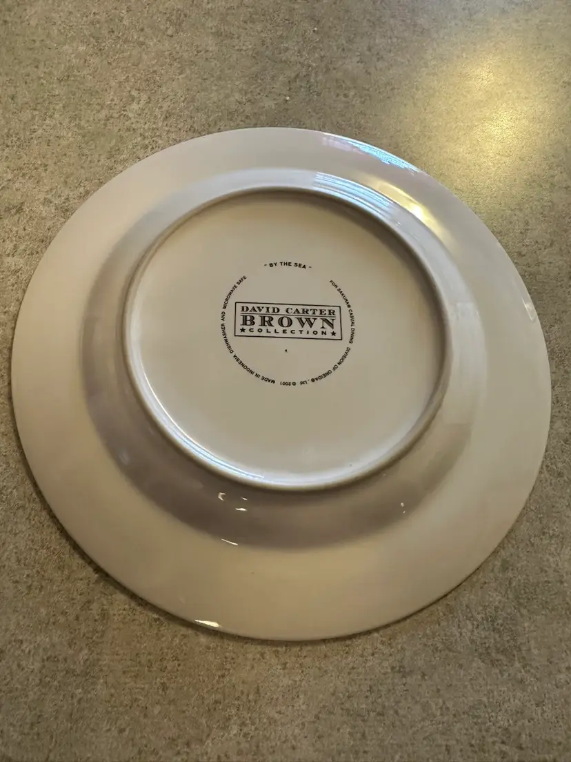 This decorative plate was produced by Oneida in 2001 as part of David Carter Brown's 'By The Sea' collection. The design features a classic red and white striped lighthouse with a keeper's cottage, set against a coastal landscape with dunes and grasses.