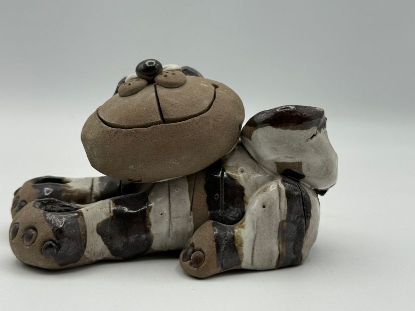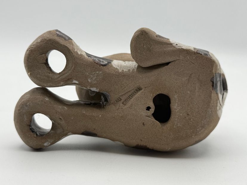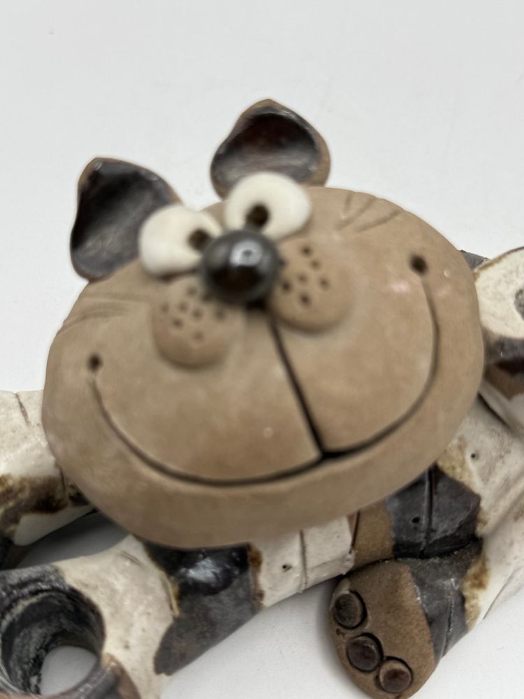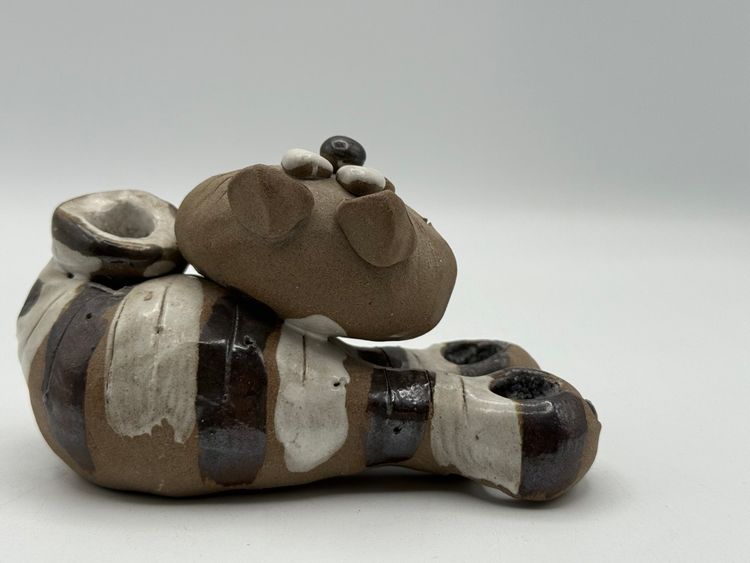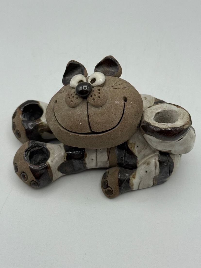 This is a vintage Nancy Ecklund pottery cat candle holder. It is a clay stoneware piece with a striped design. It can be used as a candle holder, toothbrush holder, or a decorative item