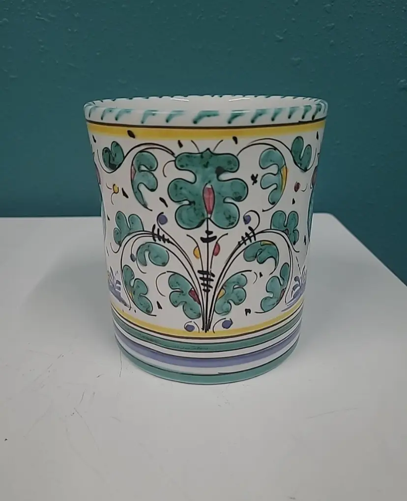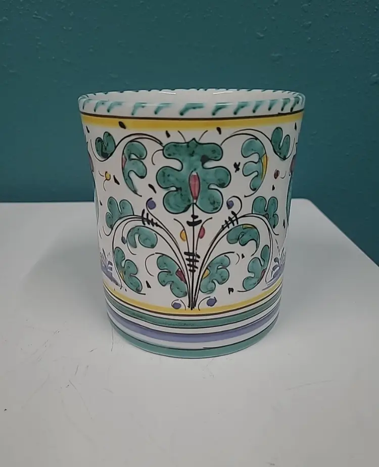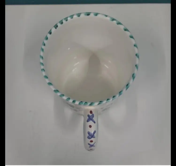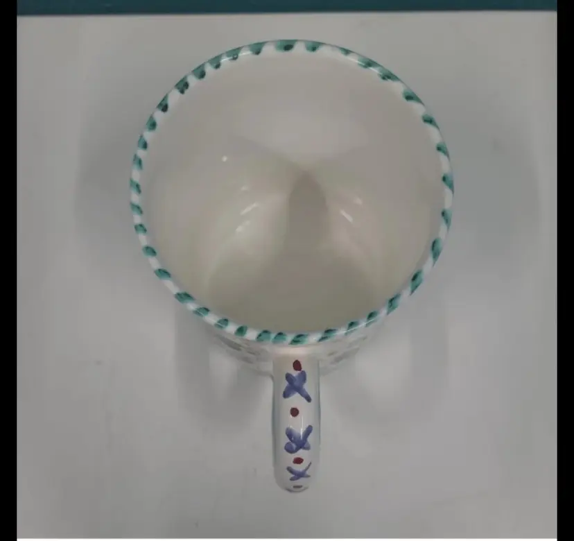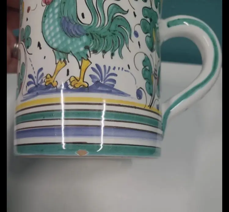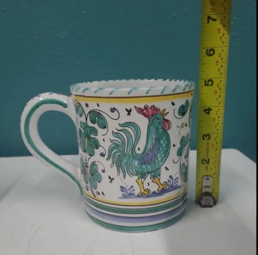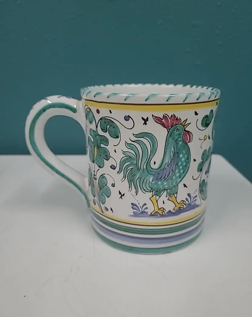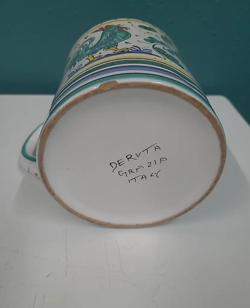 Jumbo sized Deruta Grazia Italian rooster mug. Signed on the bottom. Glazed on inside and clean. Great colors and good condition- two very small chips on bottom as shown in pics that give it its Italian character.
