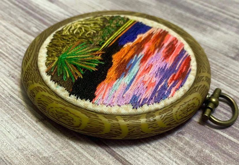 This mini embroidery depicts a colorful desert landscape, featuring a high-speed highway in the background. It is hand-stitched on printed cotton fabric.