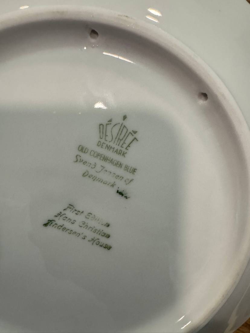 Desiree Denmark blue and white Christmas plate from 1970, featuring a person pulling a Christmas tree through newly fallen snow in a picturesque village. This is the first edition of the “Hans Christian Andersen’s House” series.