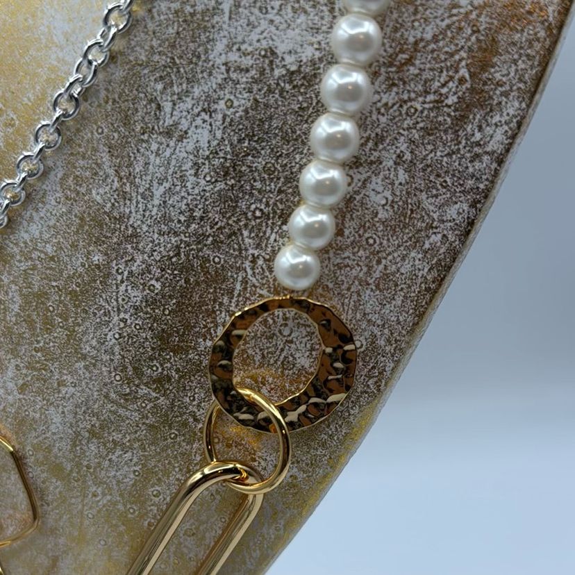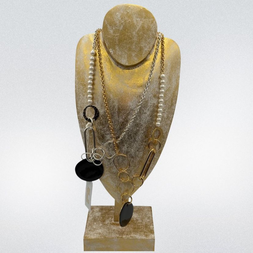 This necklace is a juxtaposition of various chain link styles, including mixed metals of silvertone, goldtone, and faux pearl strands. It features chunky links in silver and gold, with a black round enamel discs at the bottom. Item is new unused with original hangtag. This is a bold, fashion-forward piece, typical of the designer's style, which often incorporates mixed metals and statement elements. Perfect for all seasons, it would look fabulous with the designers iconic wrap dresses. Necklace measures 50” in length and looks fabulous doubled up which enhances the contrasting nature of the design. Orig. Retail $268.