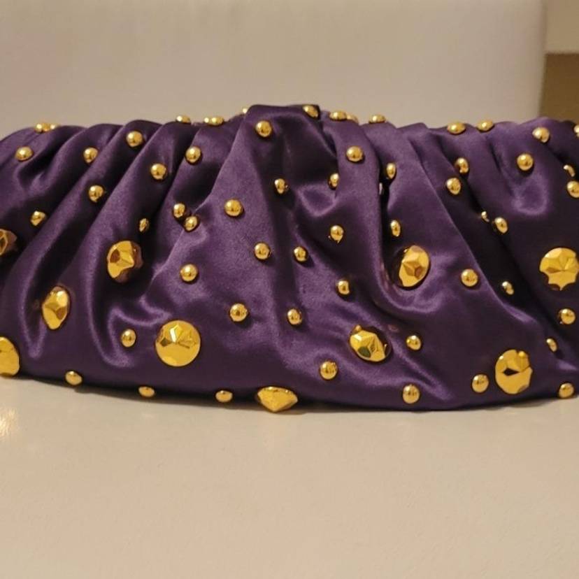Vintage Diane von Fusternberg Purple Satin Pouch Evening Bag with gold studs on all sides. This is a vintage 1980's bag that was never worn and kept in perfect condition. Signature hologram on the inside seam. See pictures for measurements