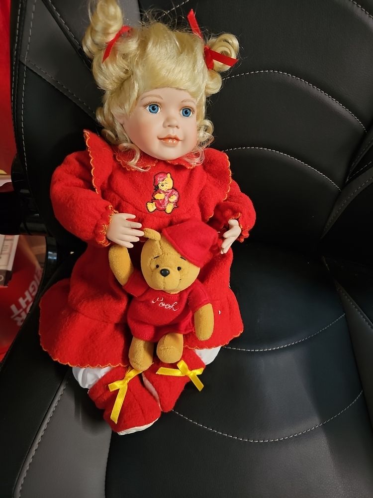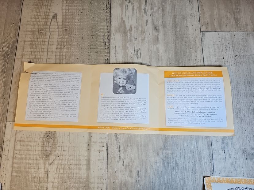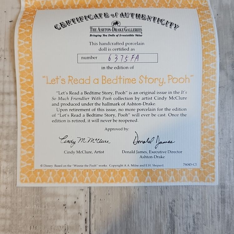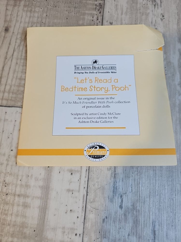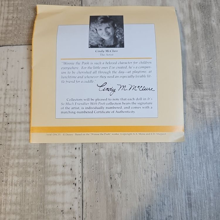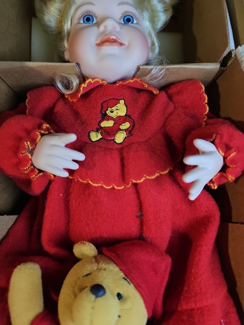 Pre-owned limited-edition Disney/Ashton-Drake porcelain doll sculpted by Cindy McClure. Comes boxed with Certificate of Authenticity, plush Pooh bear companion, and storybook insert. Excellent condition; perfect for collectors of Disneyana or porcelain dolls.