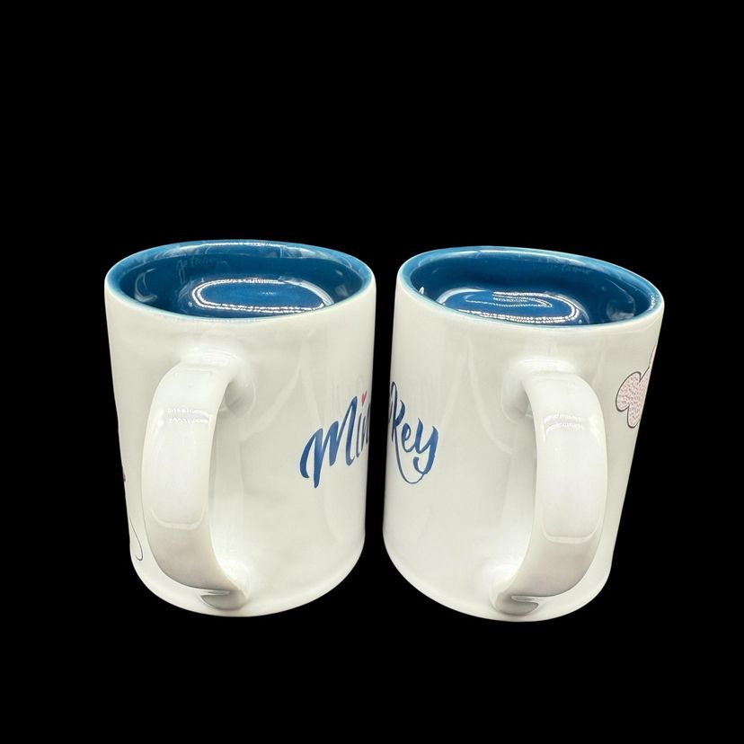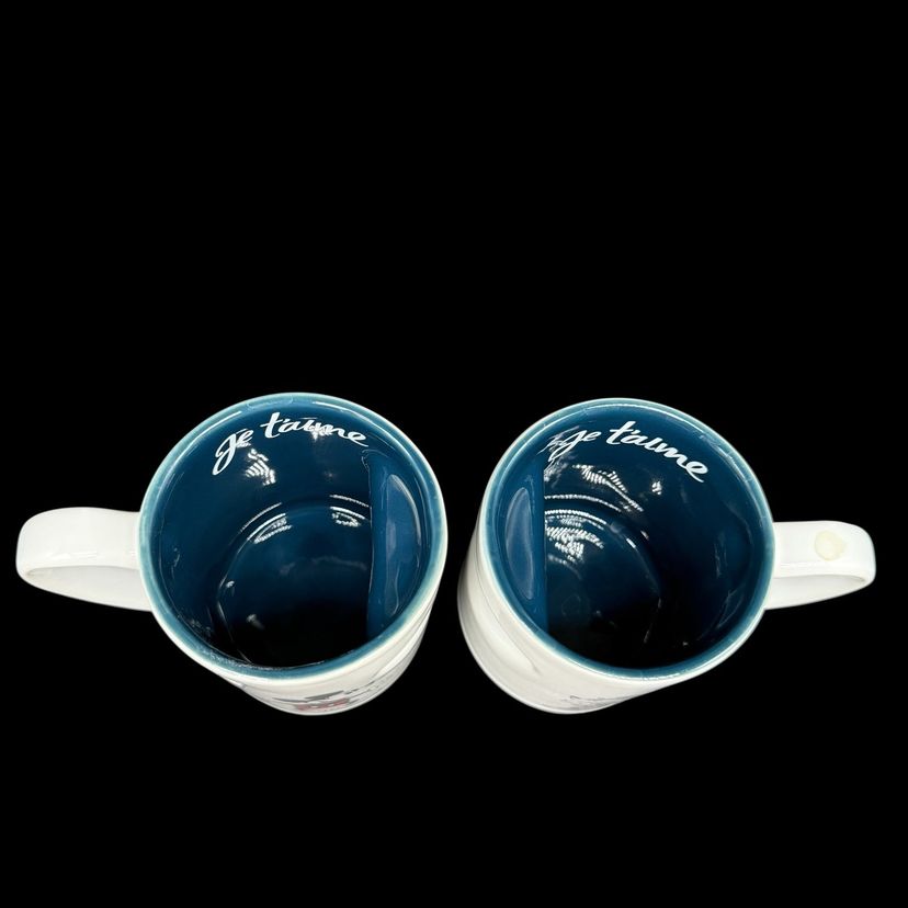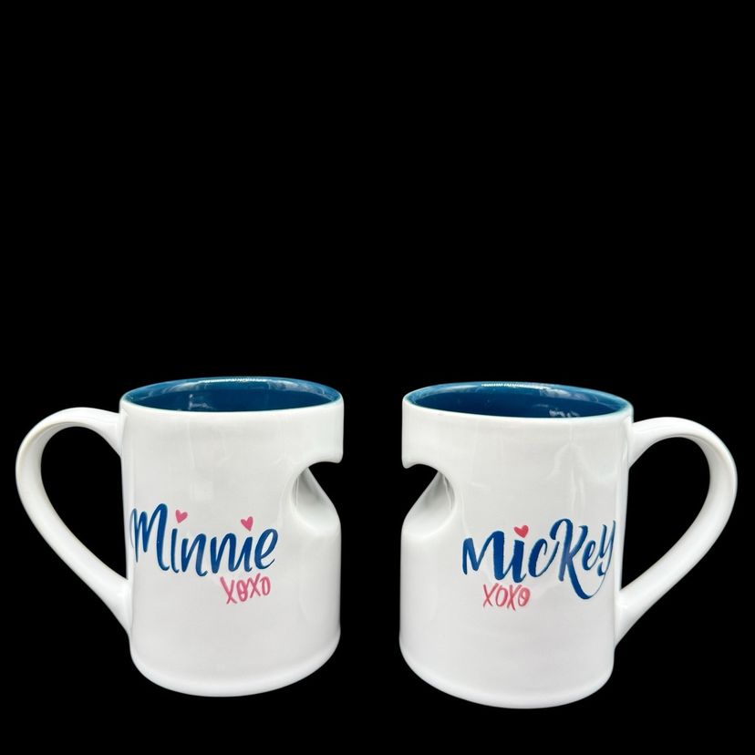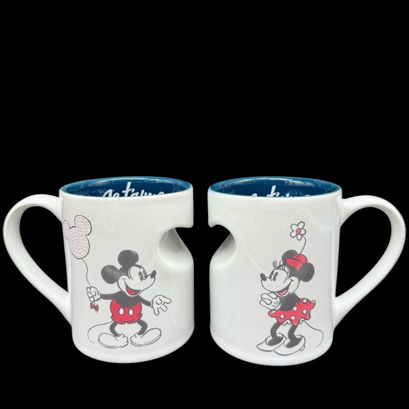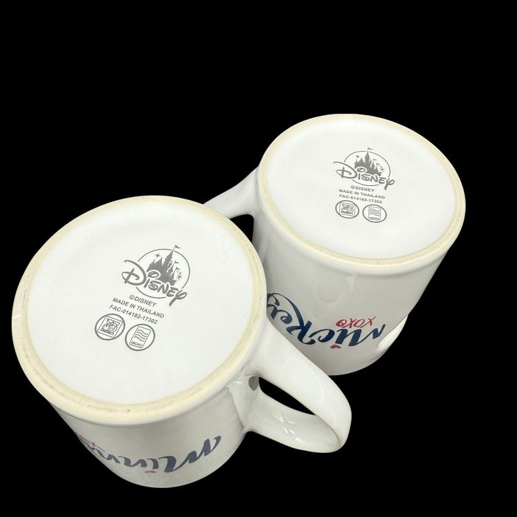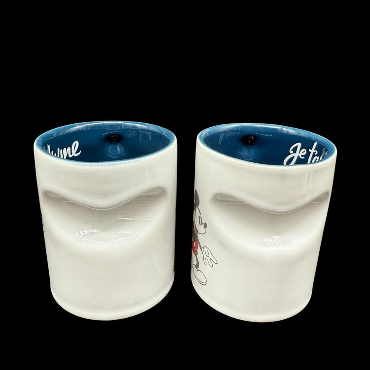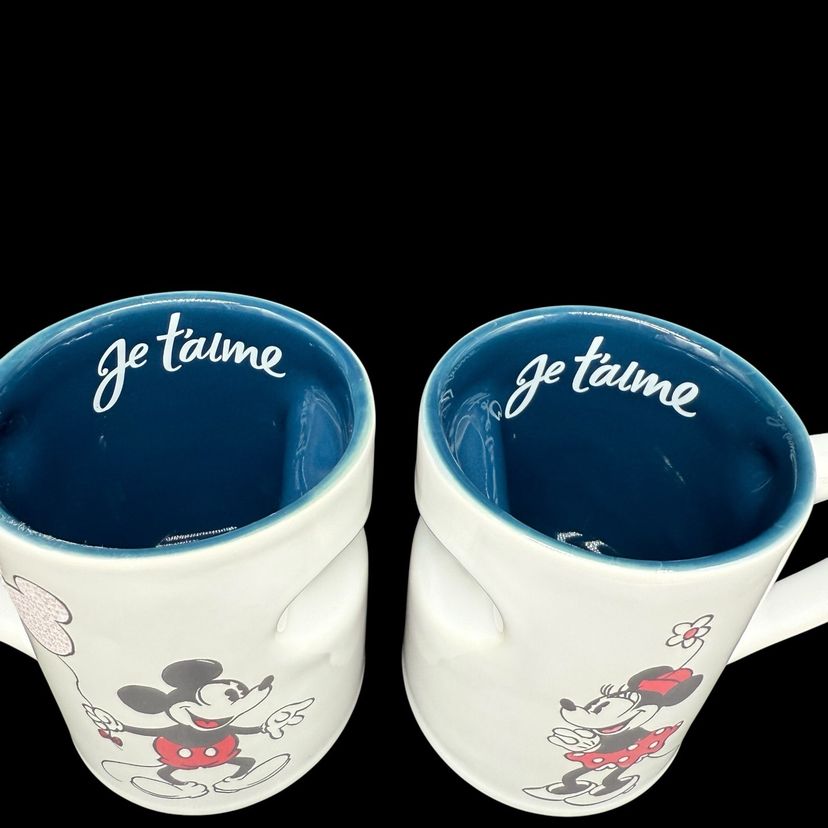 The Disney Mickey & Minnie Mouse His & Hers Mug Set is a vintage collectible featuring the beloved characters from the Disney franchise. Made of ceramic with a heart-shaped design, this set was manufactured in Thailand in 2005. Perfect for Disney fans or collectors, this set is a charming addition to any kitchen or home decor. Je Taime ("I Love You") is inscribed on the mugs, making them a sentimental and charming gift for Mickey and Minnie enthusiasts.