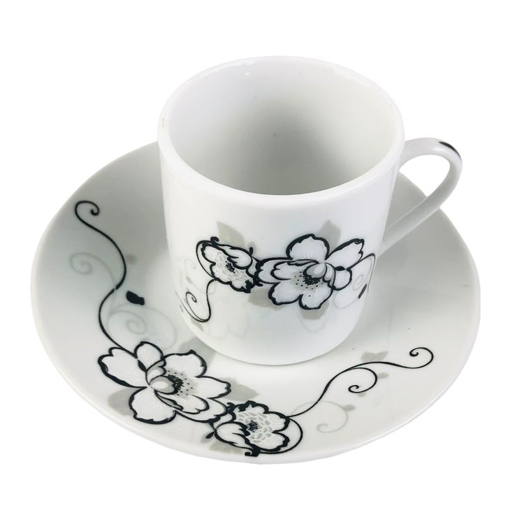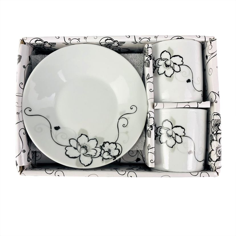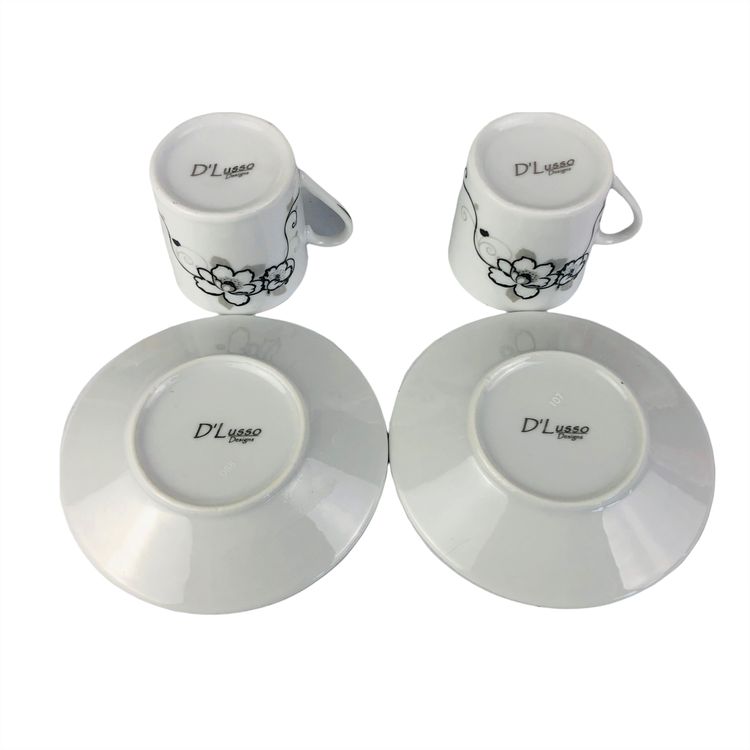 D'Lusso Espresso Set w Box 2 Cups & Saucers White Black Silver #2D55 Open Box