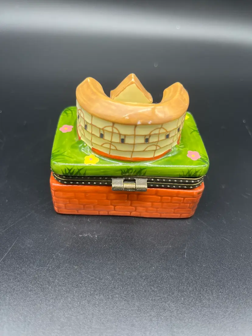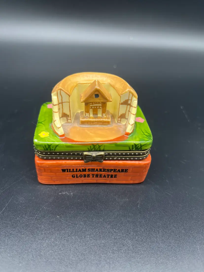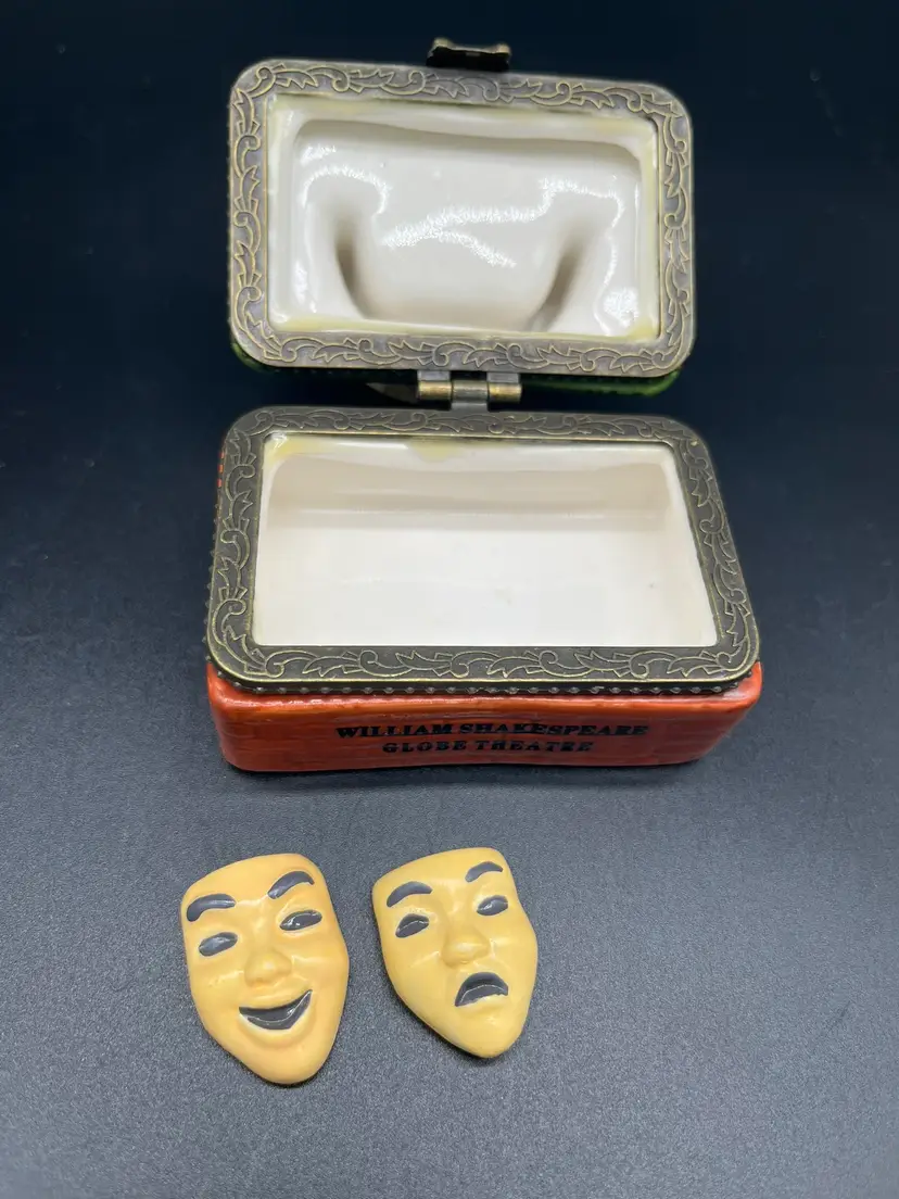 Porcelain trinket box with surprise drama masks inside. Perfect for afficionados of stage, screen and plays. Good conditions. Minor flea bites on back side of theatre (see photo). Otherwise, no chips or cracks. 2" tall, 2 1/2" wide, 1 1/2" deep. Shipping included
