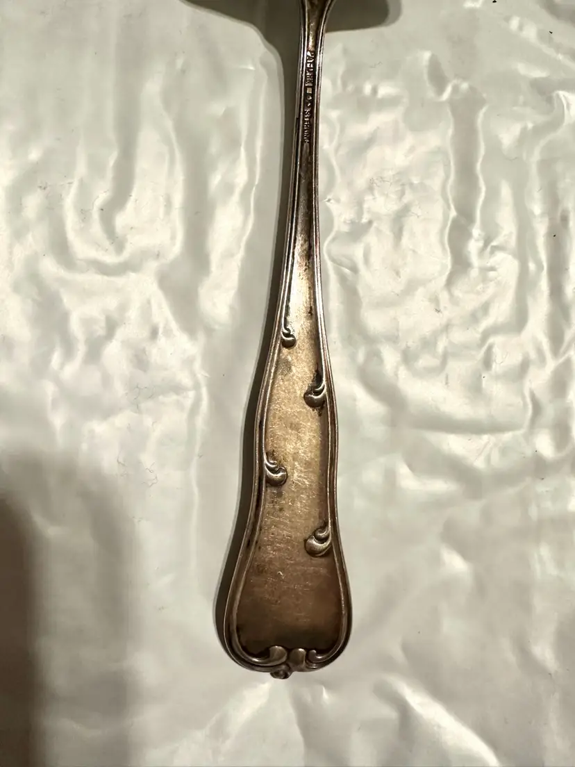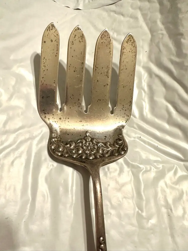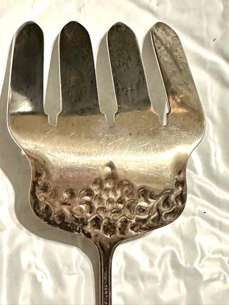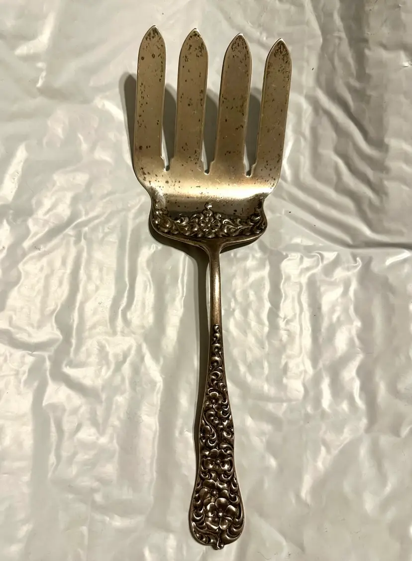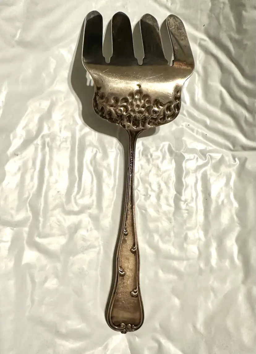 Beautiful antique Victorian asparagus serving fork made by Dominick & Haff in the Rococo pattern. It is 9.75” x 3 1/8”. It weighs 144 grams. Very good condition.