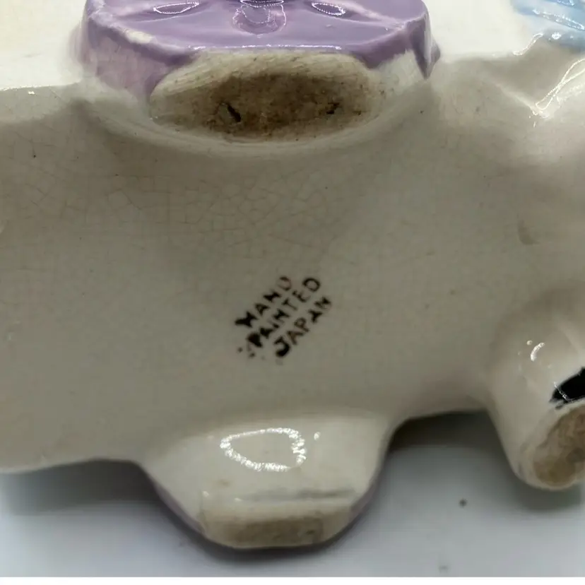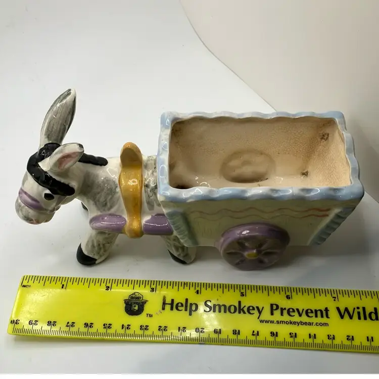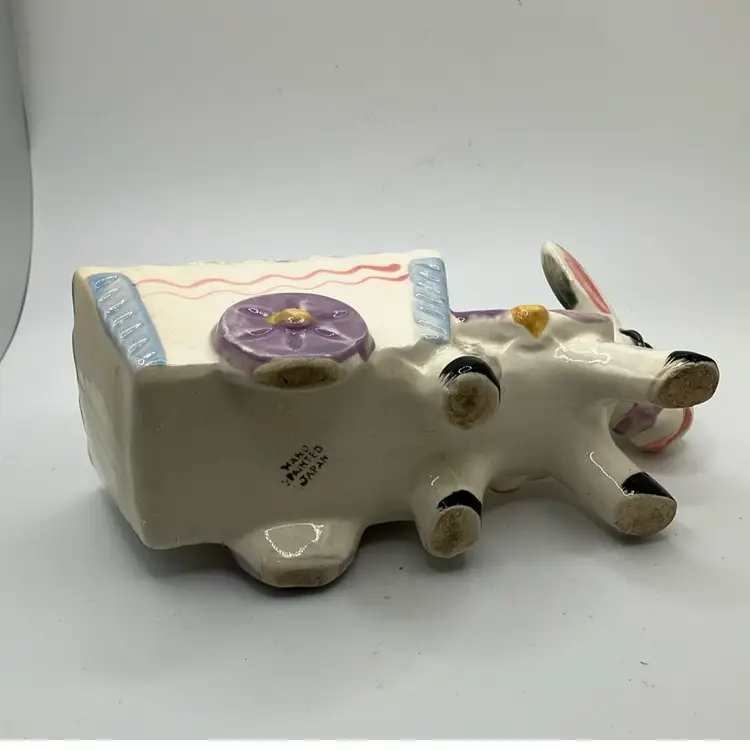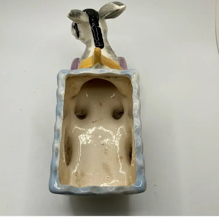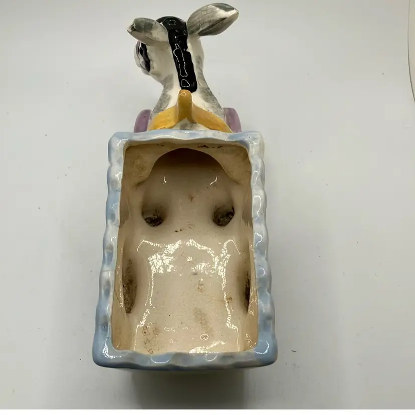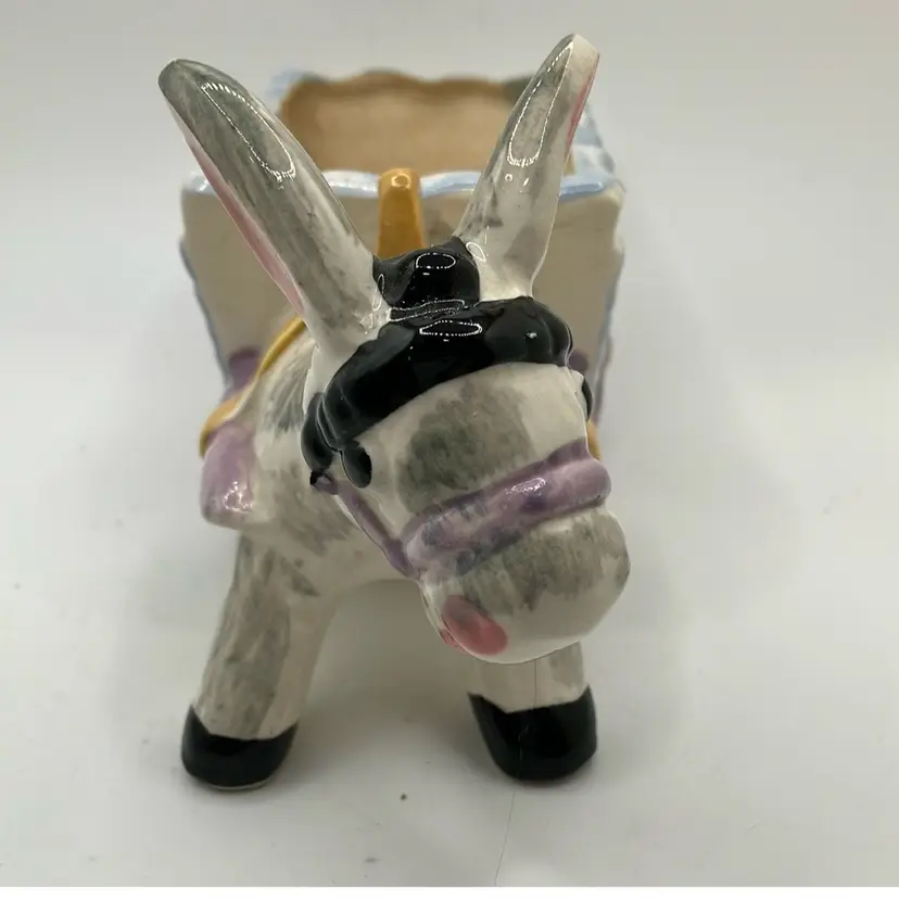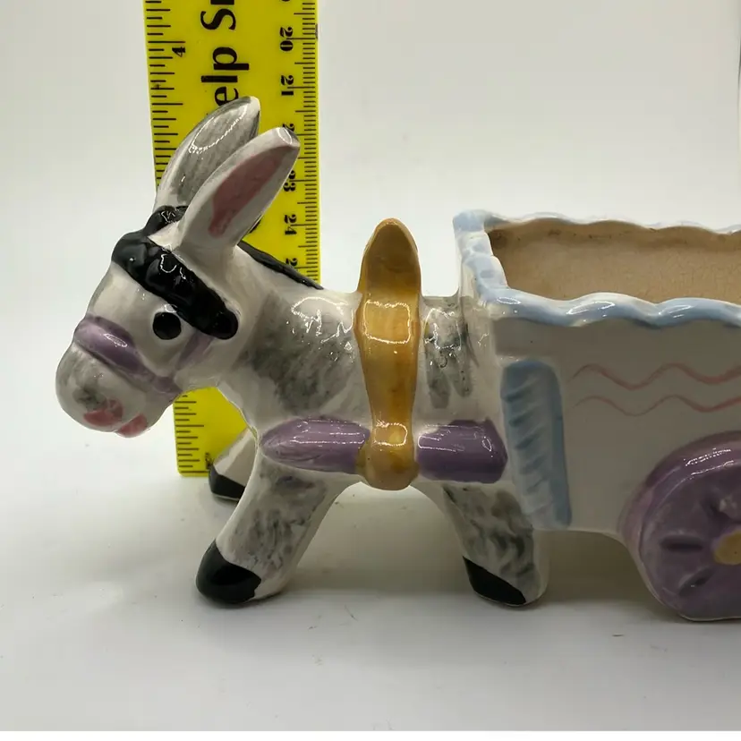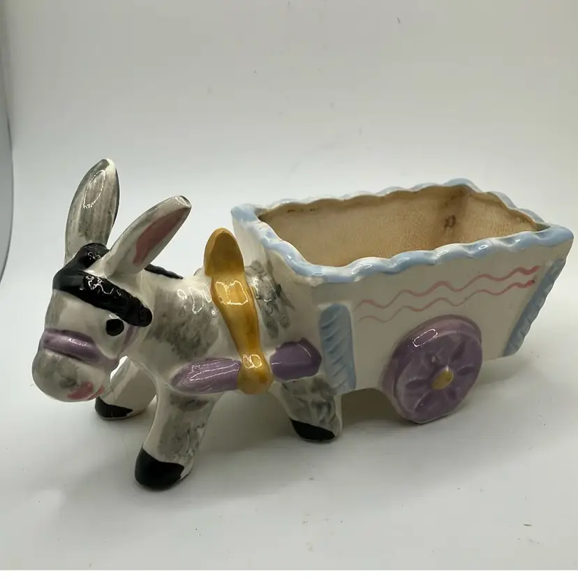 Donkey is in good condition, planter/cart could use a good cleaning and it does have a small crack on inside- does not go all the way through. Pretty pastel colors. Does have some crazing. Marked Handpainted Japan on bottom.