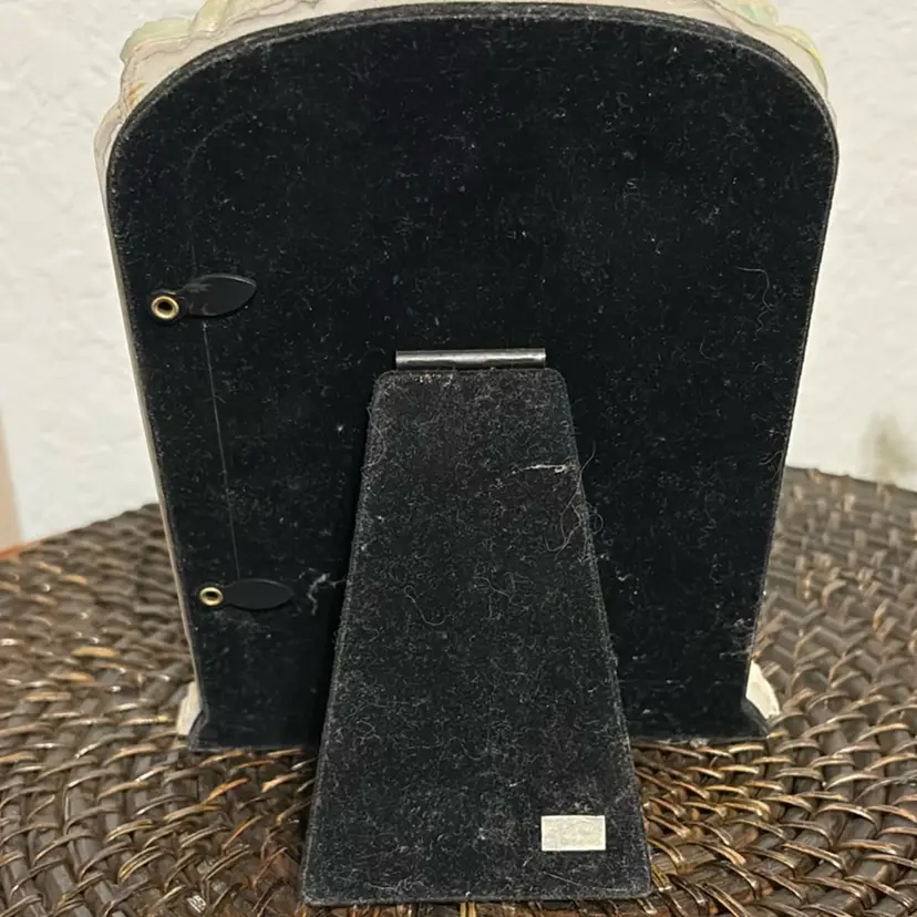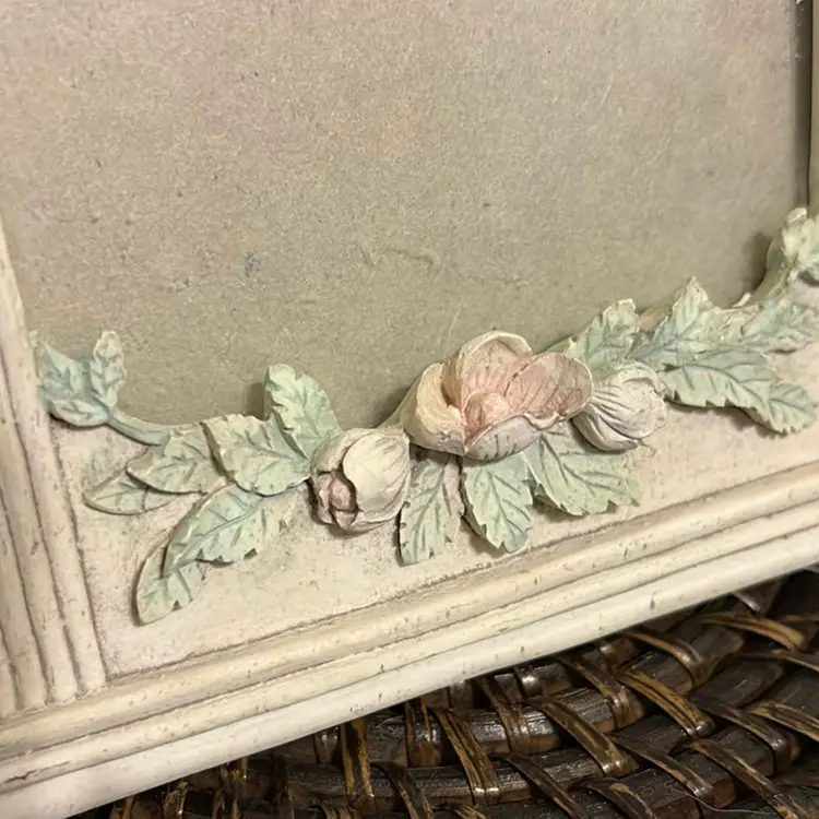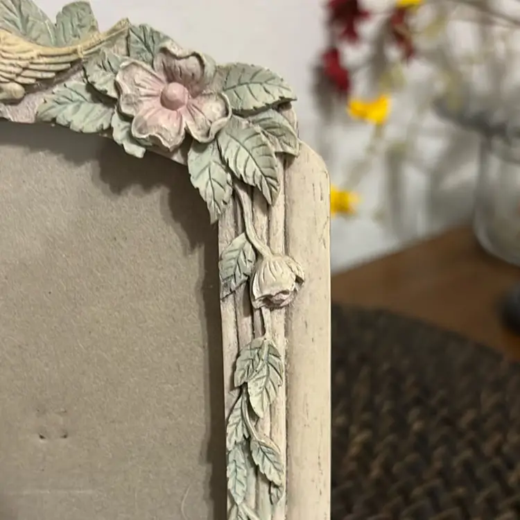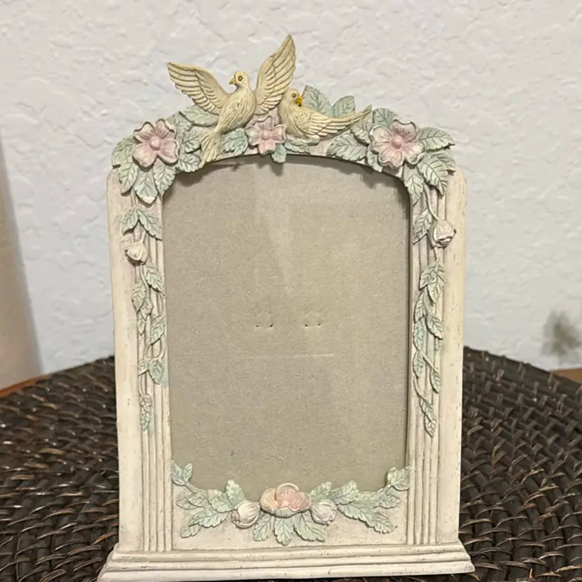This is a vintage resin picture frame featuring decorative doves and floral motifs. The frame is typically made of painted resin with a white or ivory finish. It often features two doves perched at the top, surrounded by pale pink flowers and green leaves