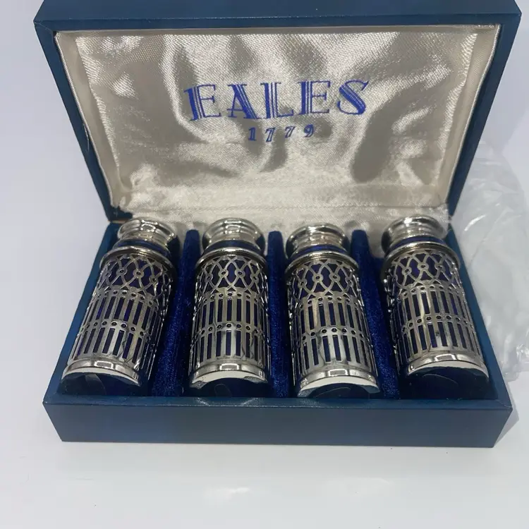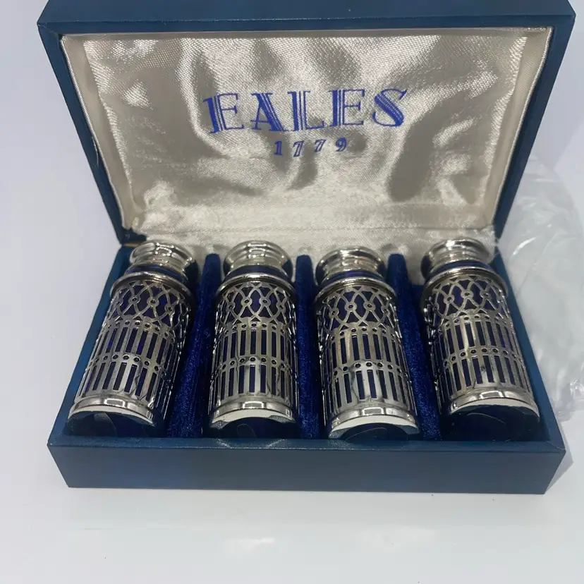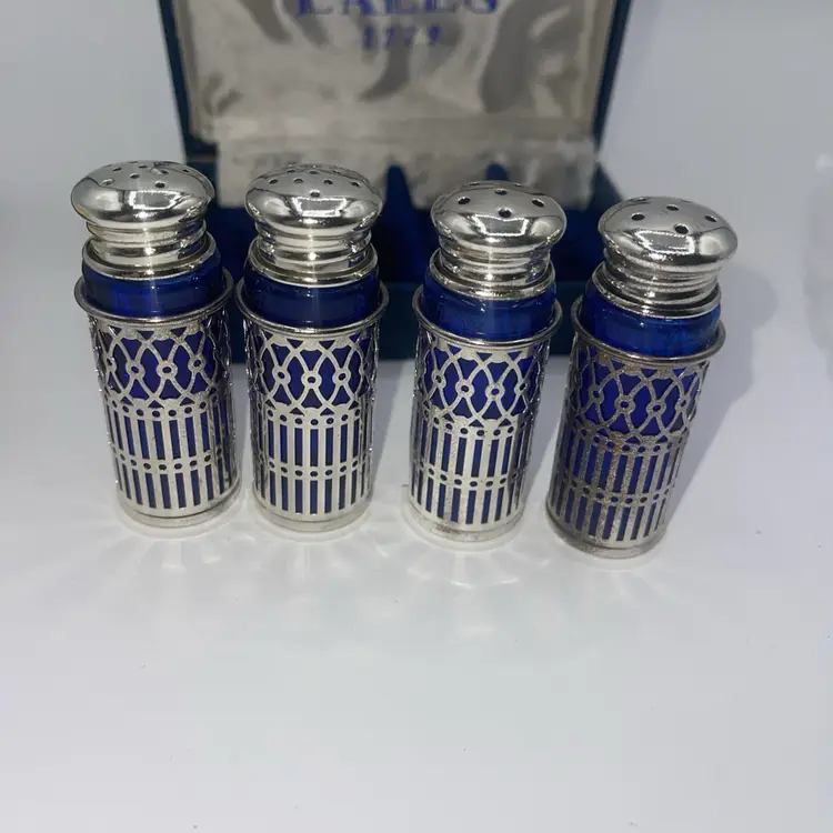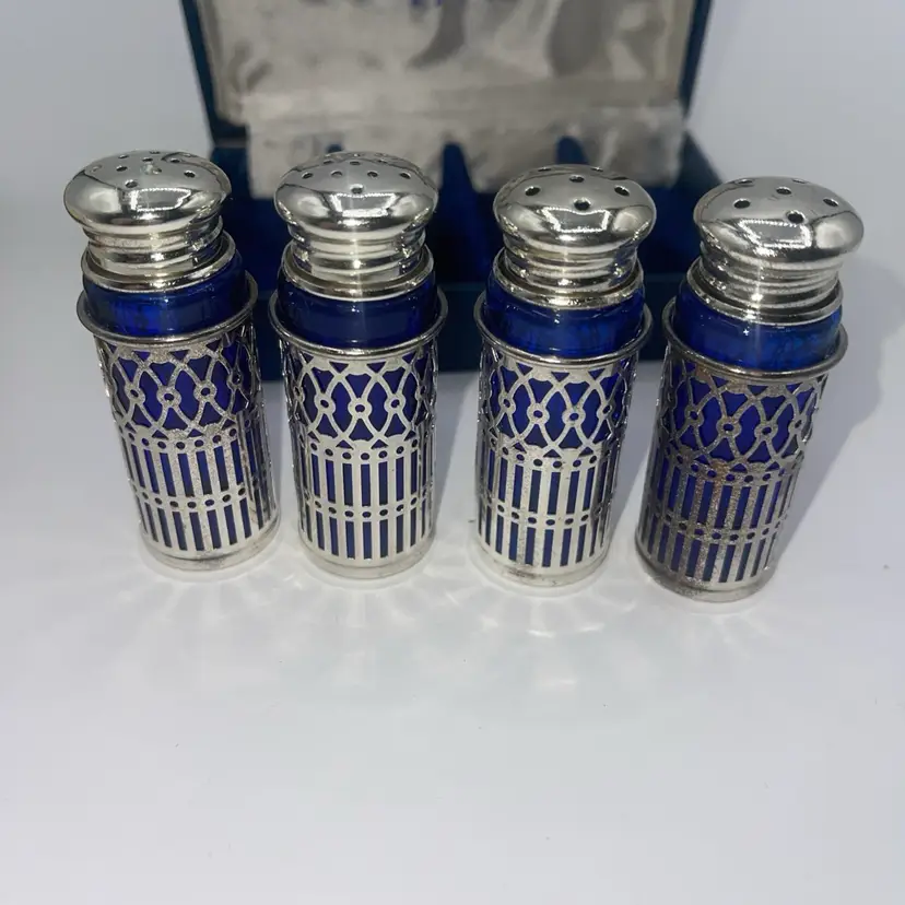 He’s a brand new never been used. There are a set of four salt and pepper shakers cobalt blue with the silver tone exterior. Please see the photos they come in their own case.