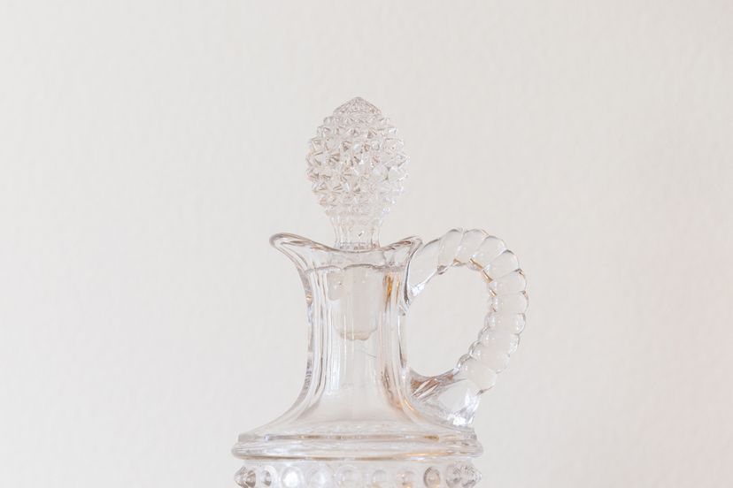 This lovely antique clear glass cruet features a classic hobnail (or “dew drop”) texture, a molded loop handle, and its original ground glass stopper. The base shows a true pontil scar — a sign that it was hand-finished rather than fully machine-made. The combination of these features places it in the early 20th century, during the transitional period when glassmaking shifted from hand-blown to semi-automated production (circa 1910–1930).