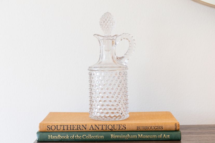 Features: Hobnail/dewdrop pattern, molded handle, ground glass stopper, pontil mark on base