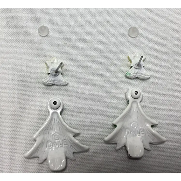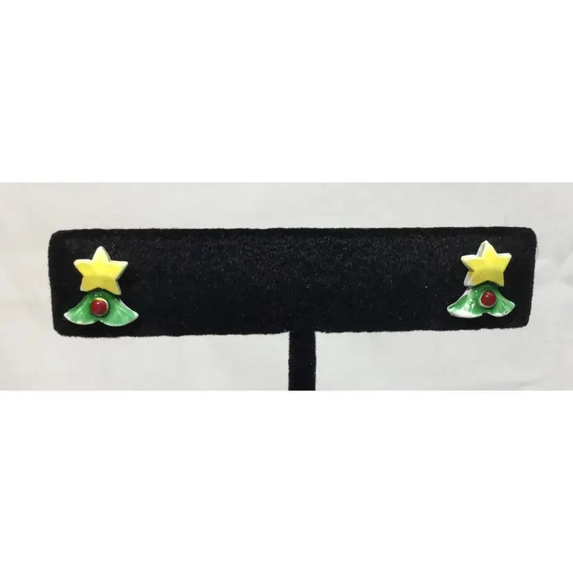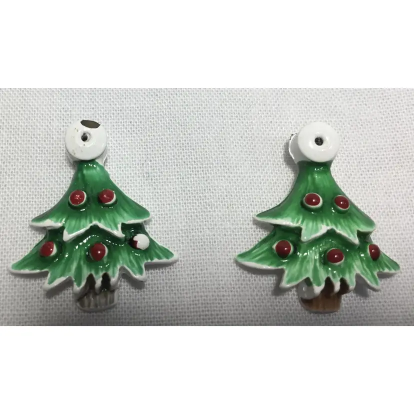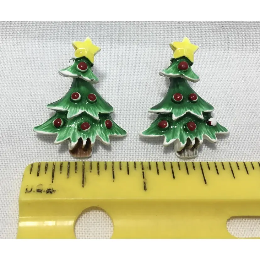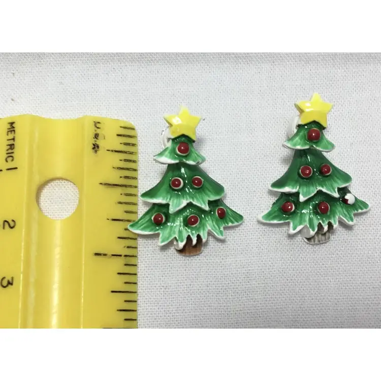 1 inch tall by 3/4 inch wide, metal, convertible earrings with enamel paint. Green branches with white "snowy" edges, yellow star, red ornaments, brown tree stand. 2 parts to each earring. Take apart to use small, one branch tree top with star. Put together to use full, 3 branched tree with stand. one earring has paint missing on one ornament and behind the tree topper part. (see all photos)