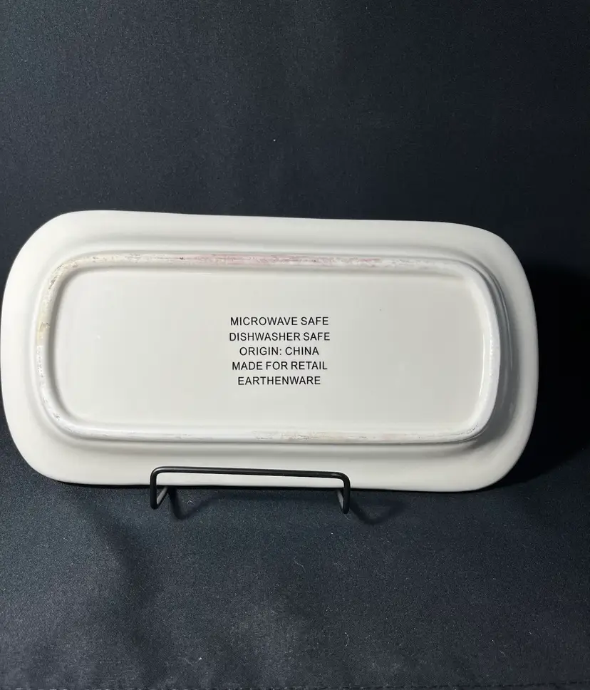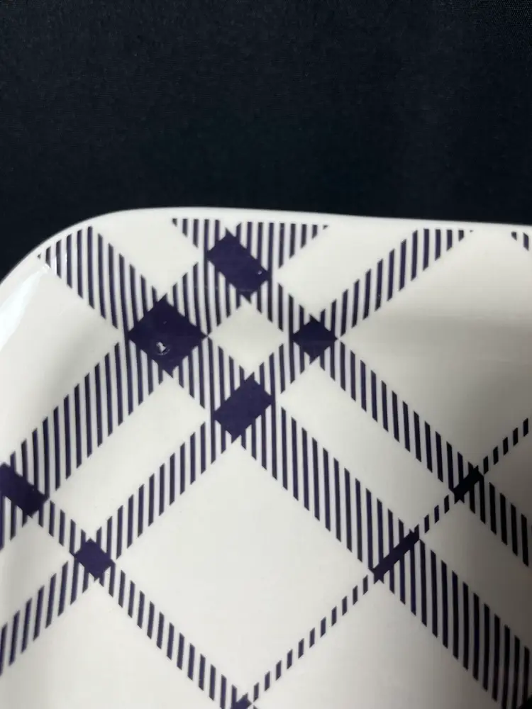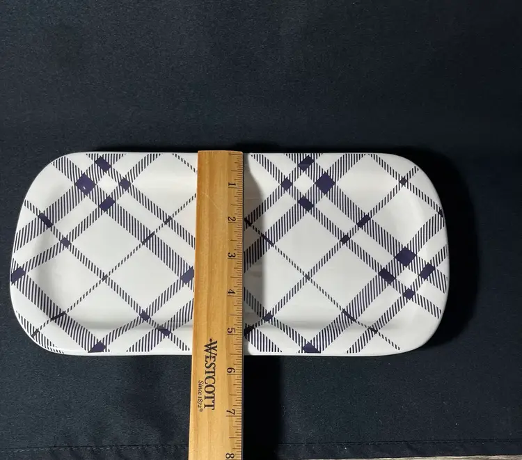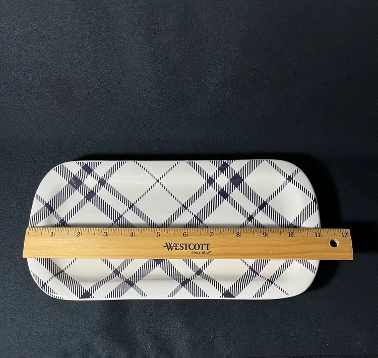 #66 Earthenware Rectangle white Serving Dish With Plaid Design in purple/gray shades. Measures 11” x 5.5”. One little mark feels like under the glaze( see last picture)