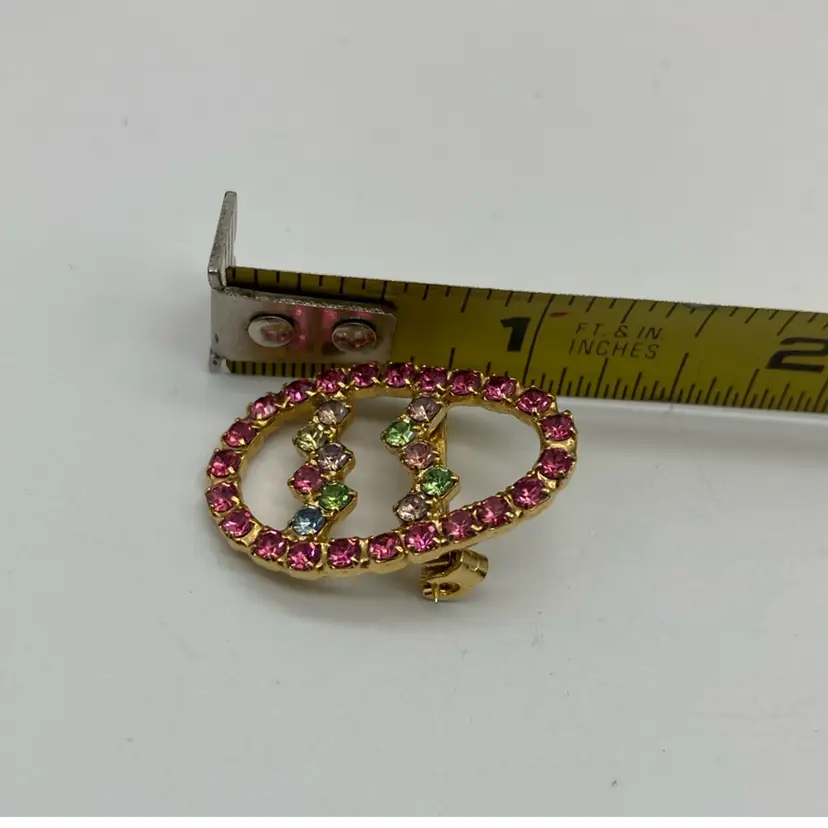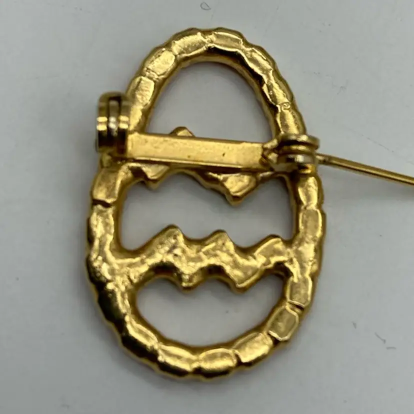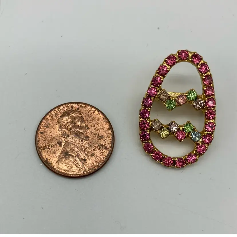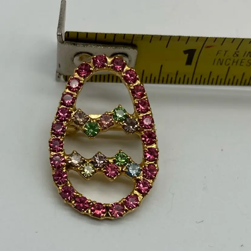 Petite Easter egg brooch is perfect to wear with a grouping of pins on your jacket. Gold-tone with pretty faux gemstones. C-clasp works well. Just 3/4” x 1 1/4"