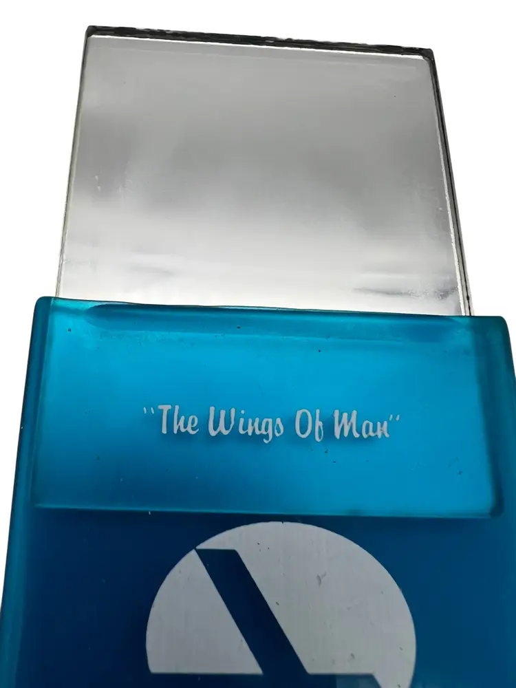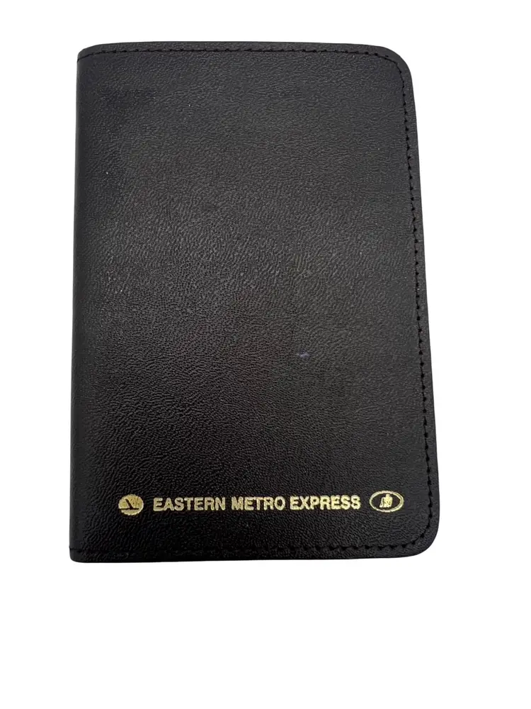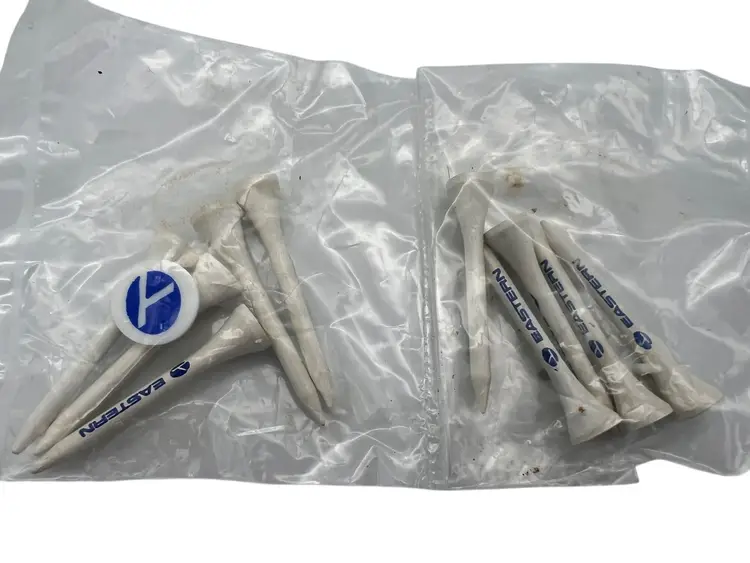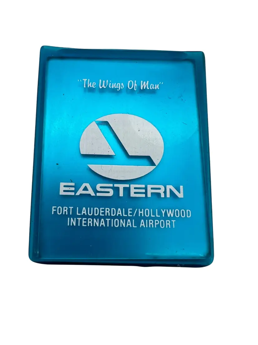 Mixed lot of vintage Eastern Air Lines promos, late ’70s–mid ’80s. Includes an unused “We earn them every day” bumper sticker; Eastern Metro Express memo pad wallet (pad unused); pocket mirror in soft blue plastic sleeve printed “The Wings of Man – Fort Lauderdale/Hollywood International Airport”; and two small sleeves of Eastern wooden golf tees with plastic ball markers. Great airline ephemera bundle for Eastern collectors.
