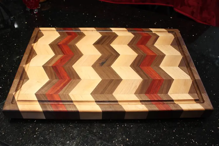 Edge grain chevron pattern cutting board - Walnut/Cherry/Maple with chevrons running vertically.