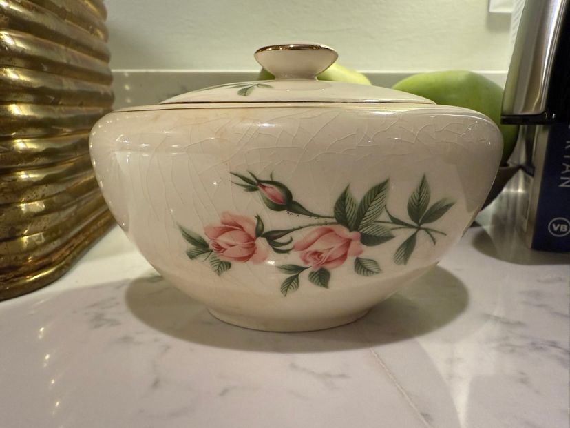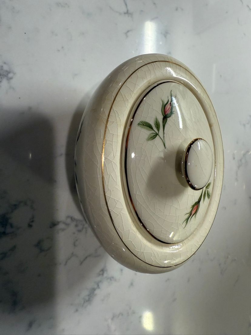 Vintage Edwin Knowles Tea Rose Covered Sugar Bowl, adorned with delicate pink roses and vibrant green leaves. This collectible piece features a beautiful crackle glaze finish and elegant gold trim on the lid and rim.