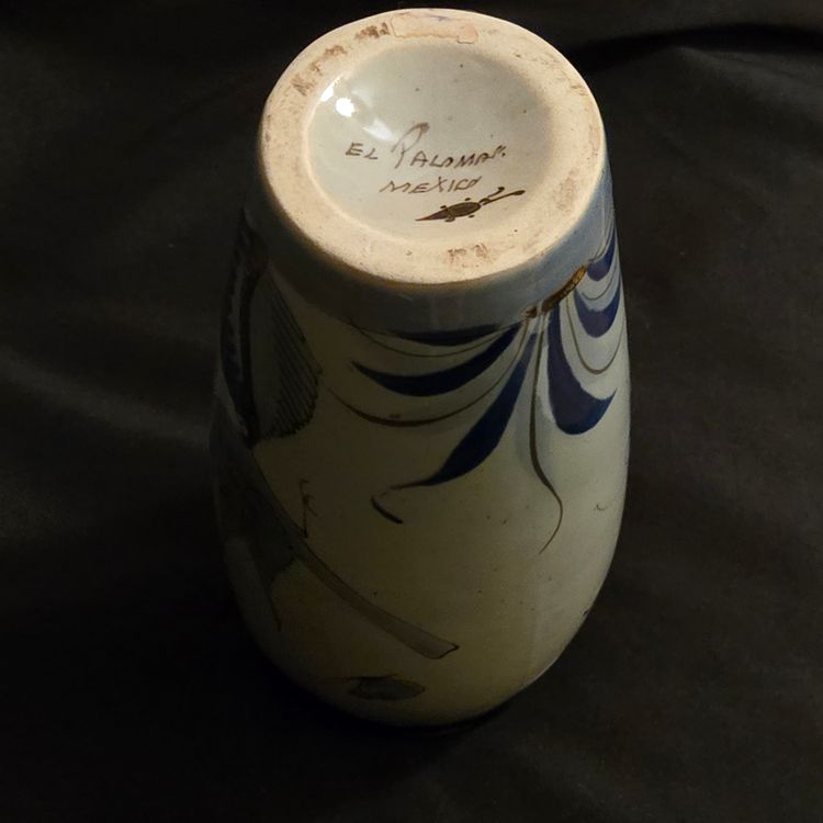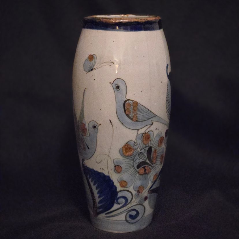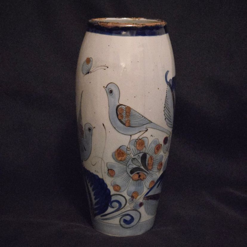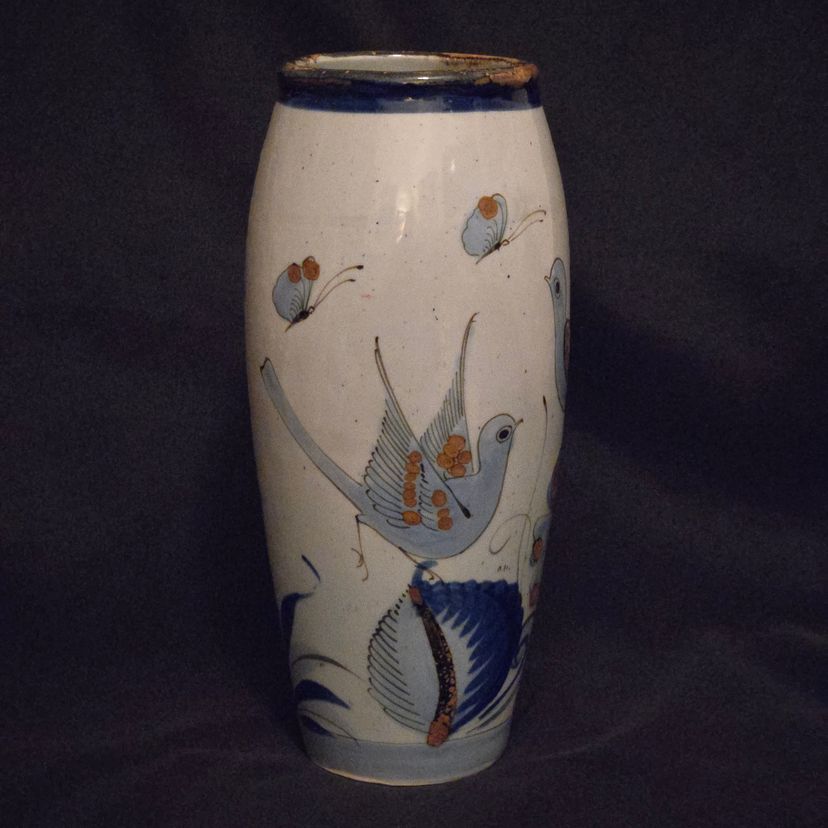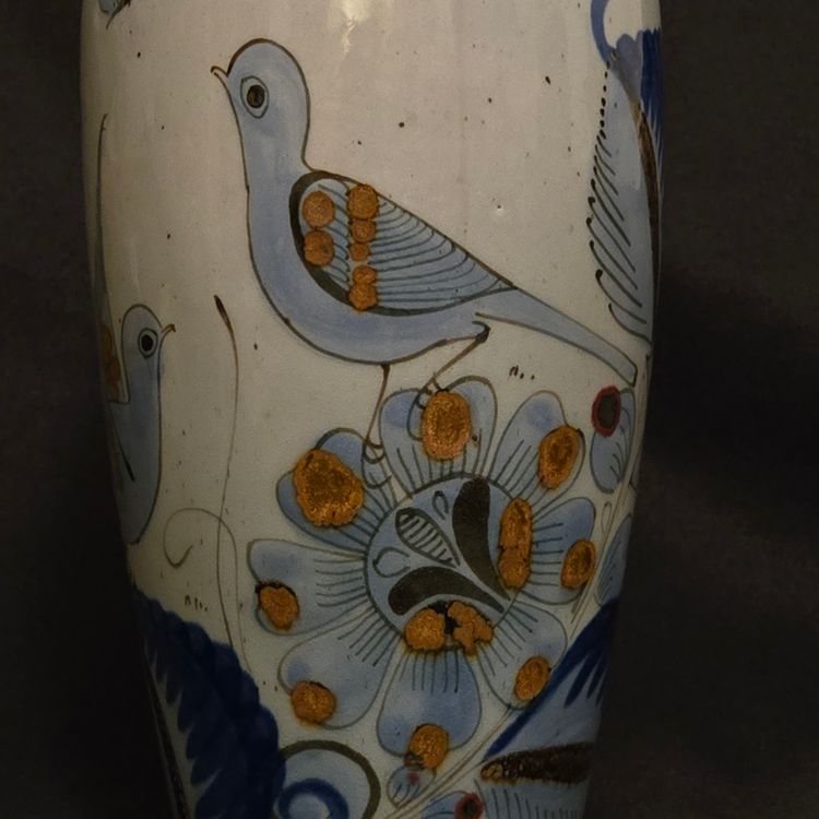 El Palomar Signed Mexico Vase Tonala Pottery Birds Floral Butterflies 11" Tall approximately Vintage. Used condition with the only small issues I see is both a residual sticker and dirt on the bottom + there appears to be seams running top to bottom. Please view all the photos and please ask any questions prior to purchase when possible.