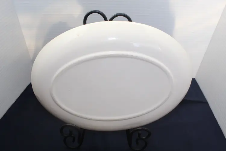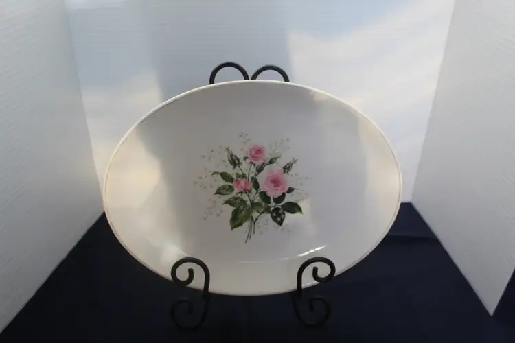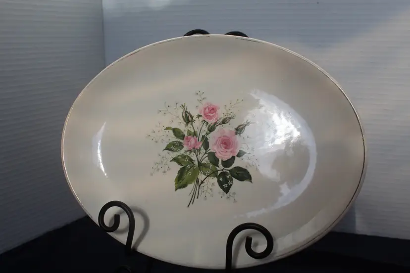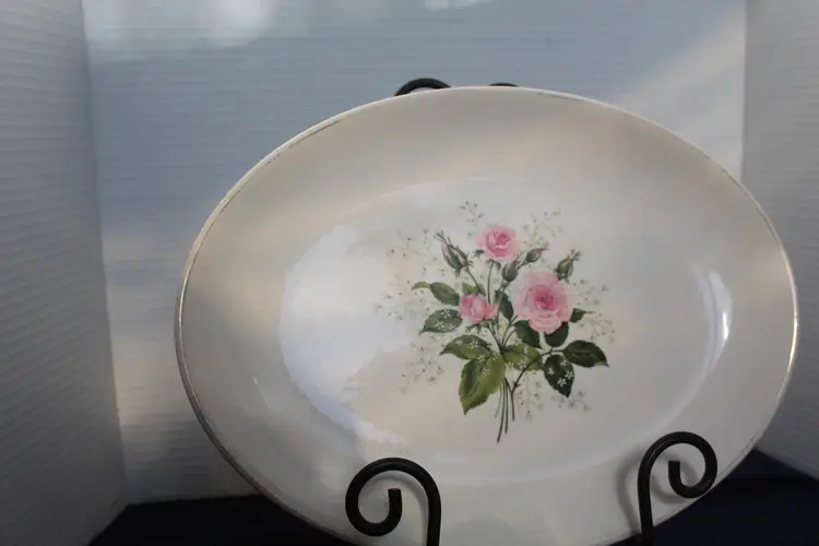 This exquisite platter is a vintage original made by Embassy China in the USA. It features a beautiful EMB68 pattern with pink roses and white and platinum accents. The oval shape and porcelain material make it a elegant and classic choice for any special occasion. The platter measures 15 5/8" and is perfect for serving your favorite dishes.