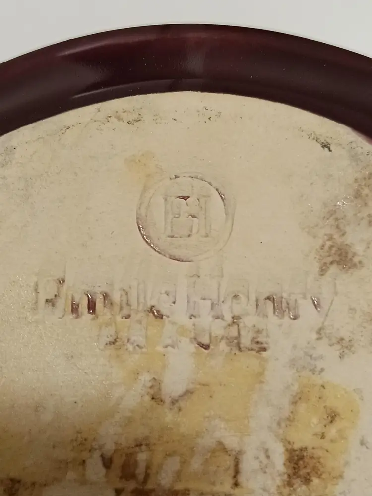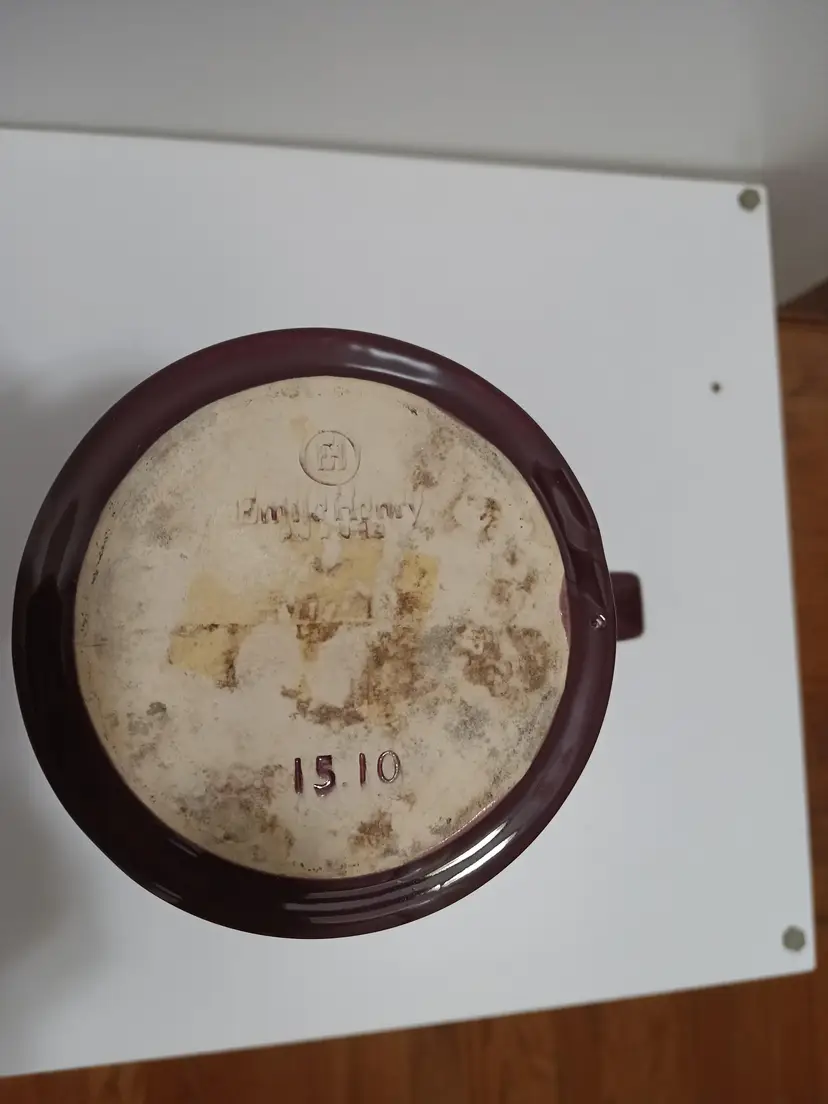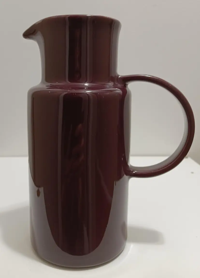 Emile Henry Pitcher; #1510.Mulberry; Made In France; 9" Tall x 7" Wide Handle thru Spout" 4" base; Very good condition; no chips or cracks Marked with EH and Name Emile Henry 1510.