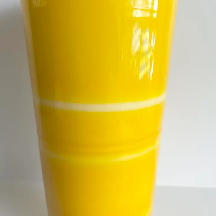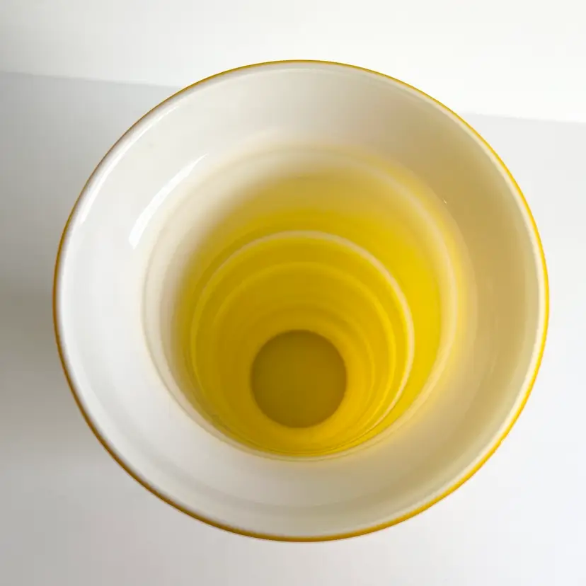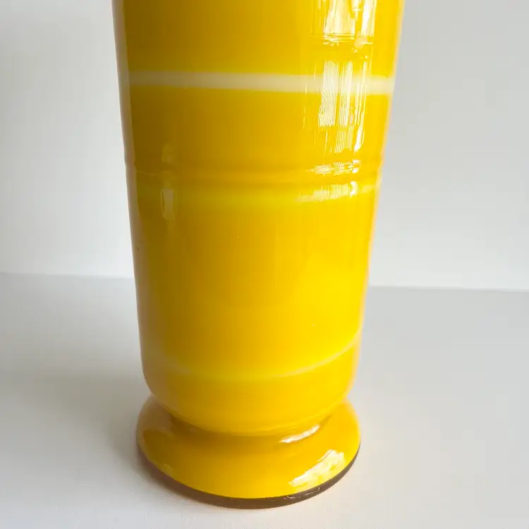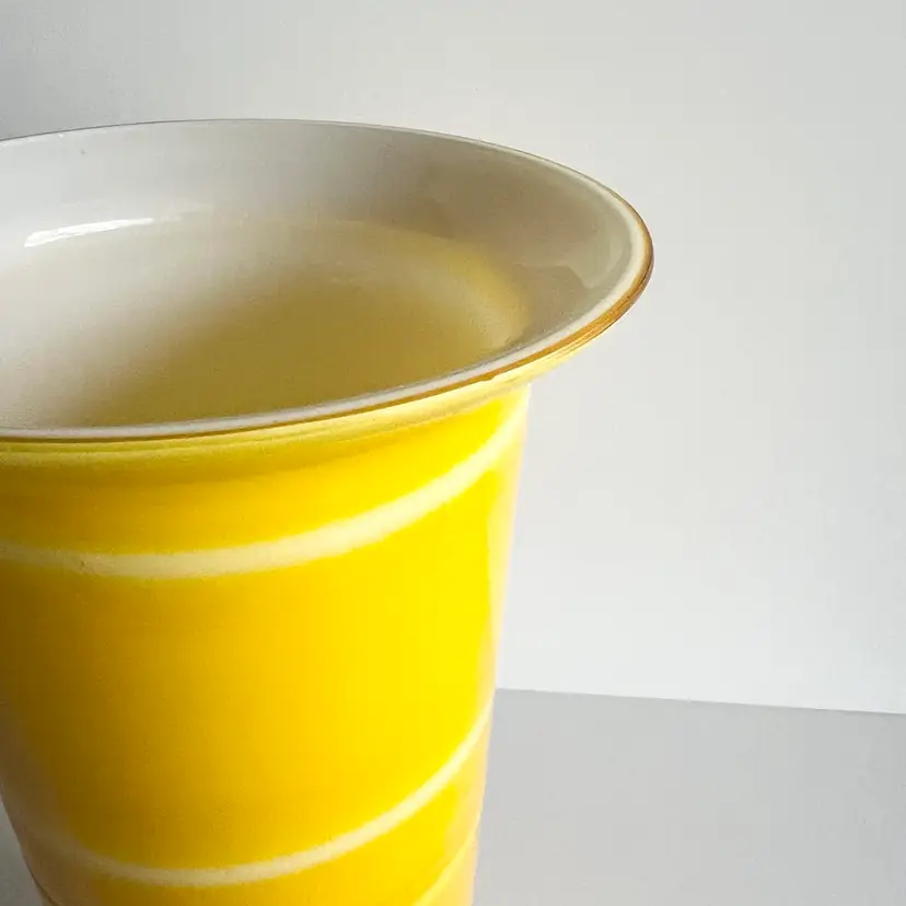 This beautiful bright yellow case vase in the Scandinavian style was likely made by an Empoli glass studio. It is white in the inside and has a polished rim. One small flea bite on rim. 9 inches tall by 1/2 inches wide. Ships from Canada.