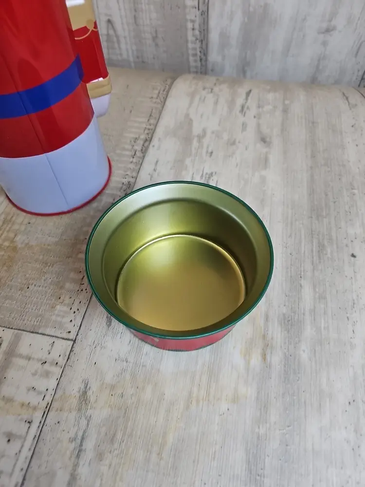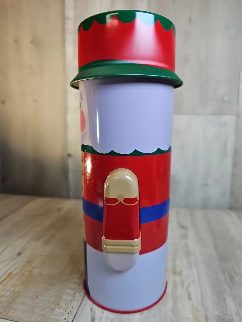 This festive nutcracker soldier tin stands approximately 9.5 inches tall and features bright red, green, and gold holiday colors. The lid fits securely, and the interior is clean and ready for use. Perfect for Christmas décor, candy storage, or as a collectible seasonal display piece.