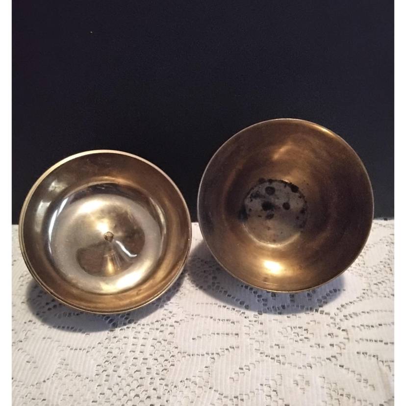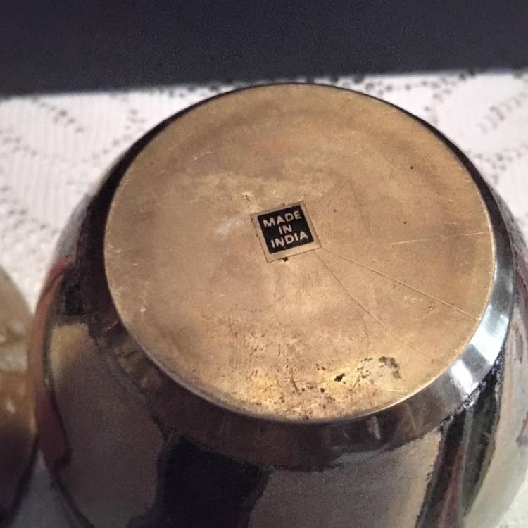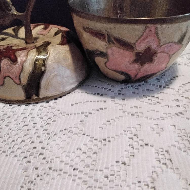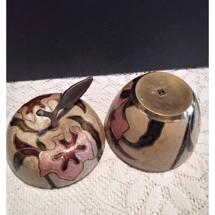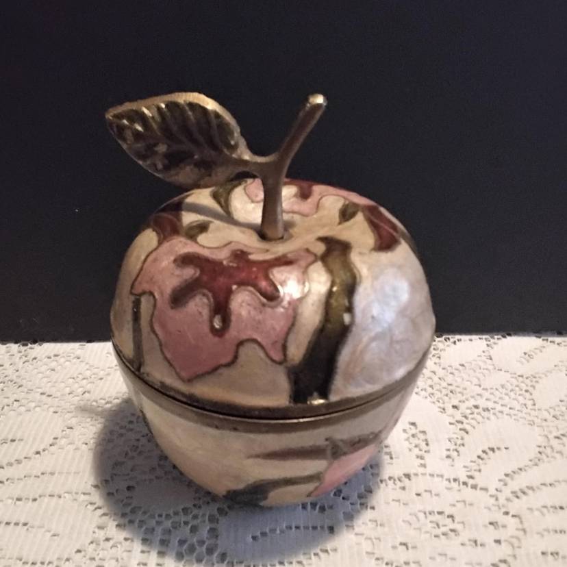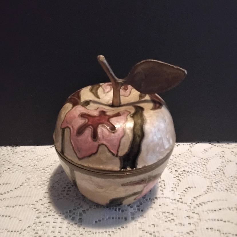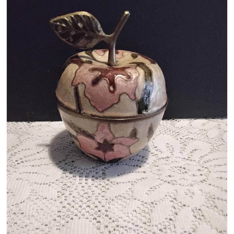 Enamel on Brass Apple Lidded Trinket Holder Made in India Pre-Owned 1980's with flower design. Colors are Green, Pink, Dark Red and a Marbled Beige. Copper inside. It is 5 inches inside 4.6 inches wide. It is in good pre-owned condition with some tarnished spots and wear inside. Small amount of scratching on the bottom. Photos are part of the description.