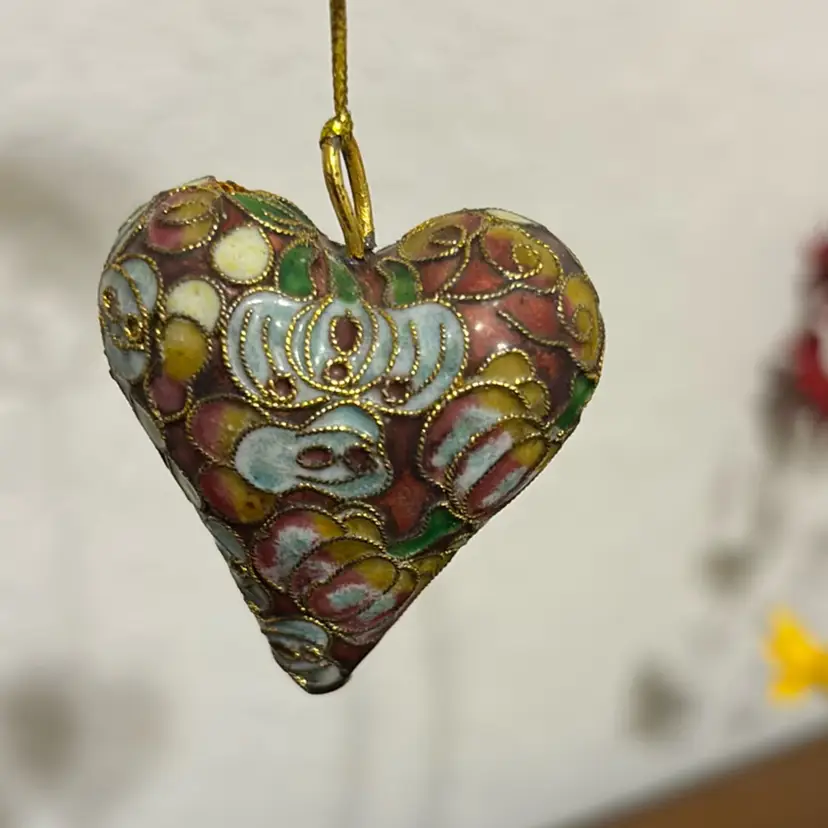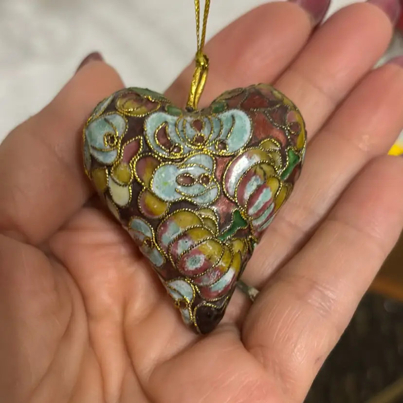 This is a vintage cloisonné floral enamel puffy heart pendant or ornament.